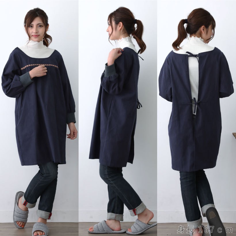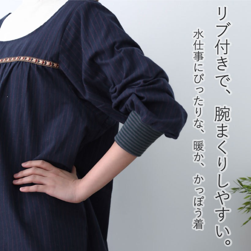 チロリアンテープがアクセントのおしゃれなデザインのかっぽう着、暖かくて、機能的なリブ付きデザインが便利と人気のエプロンです。かっぽう着は、小さなお子様や、ペットのいる家庭におすすめのエプロンです。