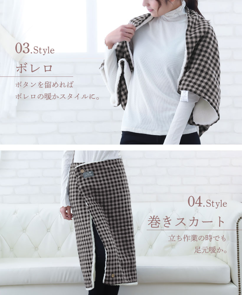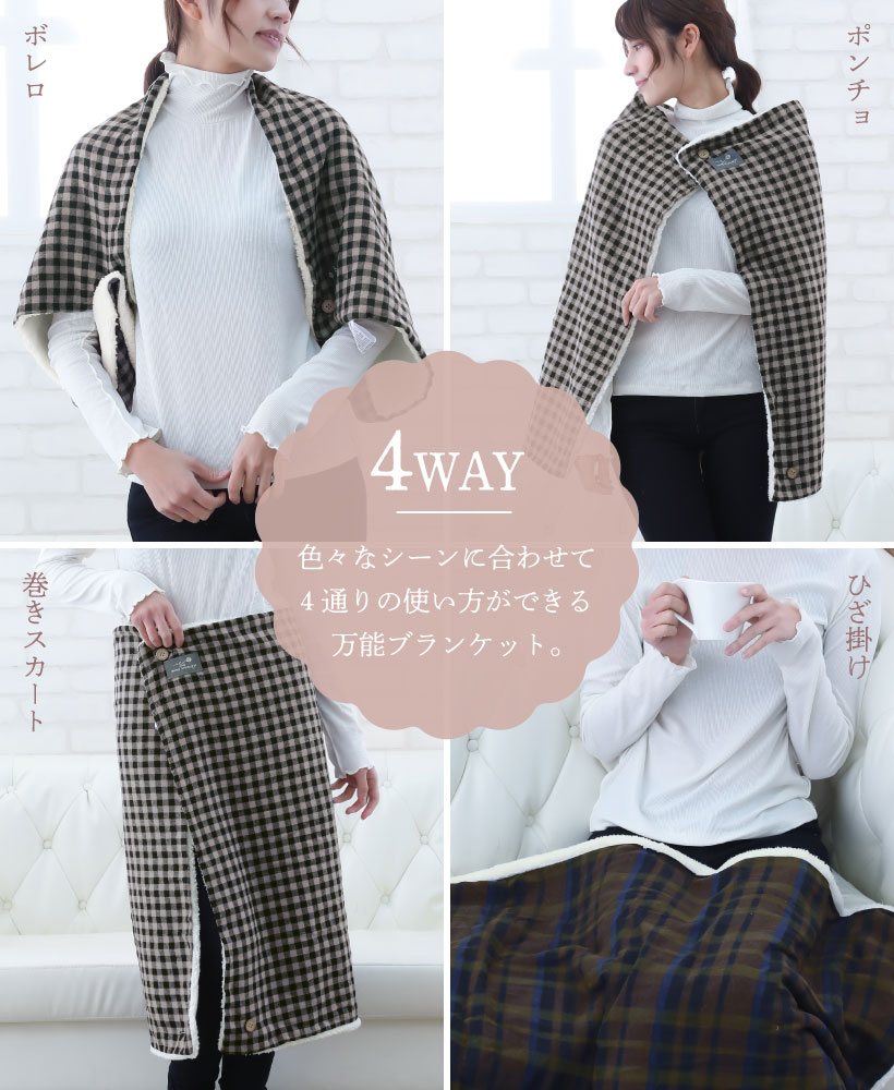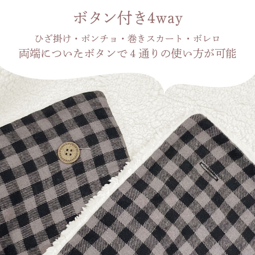 ポリエステル 綿 レーヨン ブランケット 4way 4通り ひざ掛け ボレロ ポンチョ 巻きスカート 冬 防寒対策 寒さ対策 暖か 裏ボア シープタッチ ふんわり もこもこ ボタン 学校 職場 家 くつろぎ時間 昼寝 ブラック ネイビー ベージュ グレイ 黒 紺 灰 サイズ S おしゃれ かわいい 落ち着いた 大人 子供 チェック