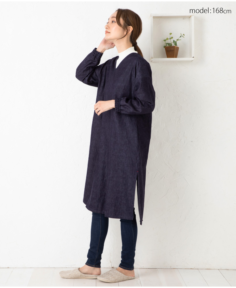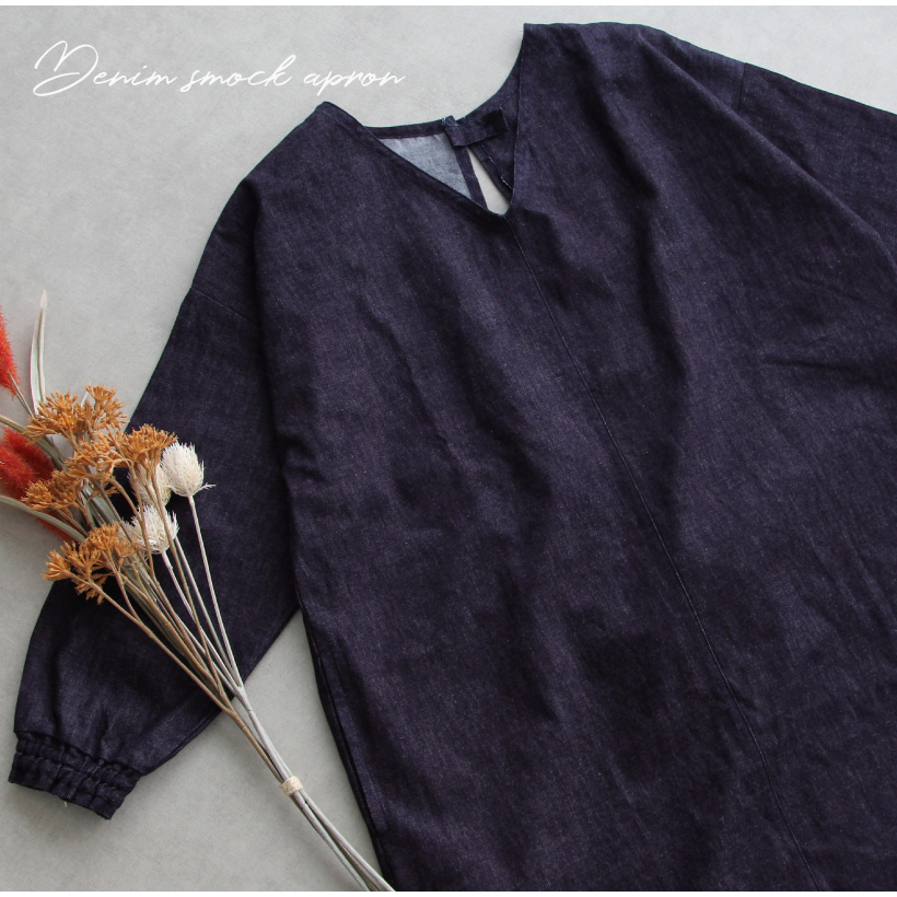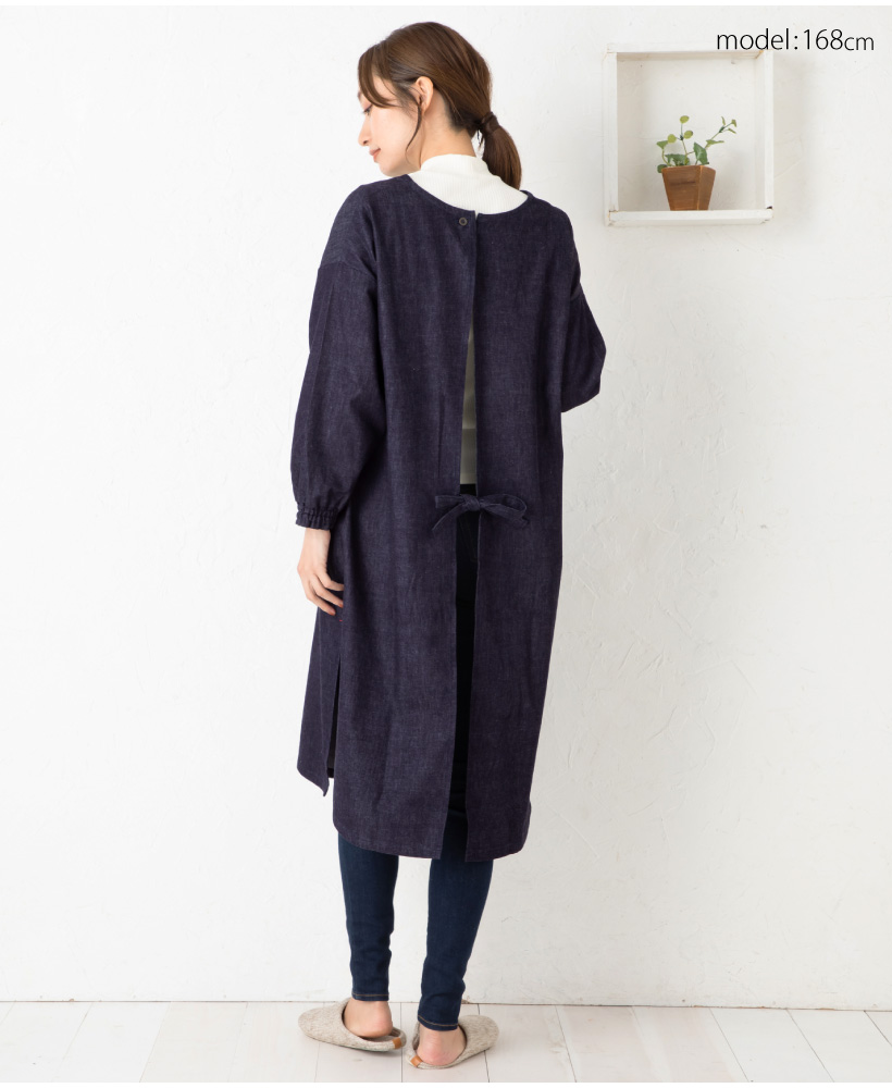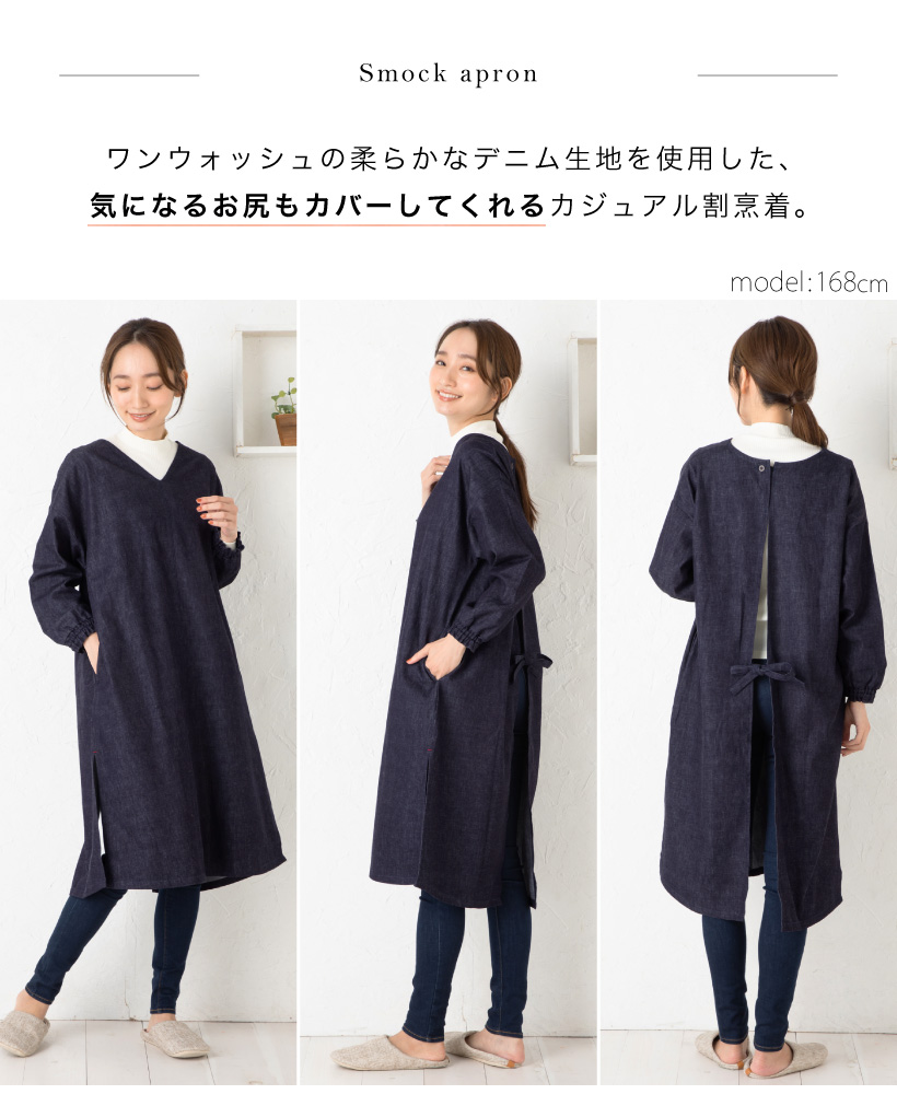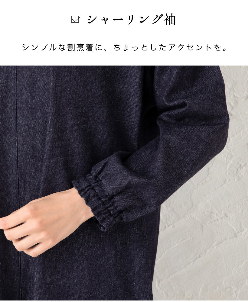 ワンウォッシュ デニム 体型カバー a0114 ネイビー 割烹着 かっぽうぎ スモック 大人可愛い シャーリング 袖ゴム 腕まくり 家事 キッチン 水仕事 おしゃれ かわいい 秋冬