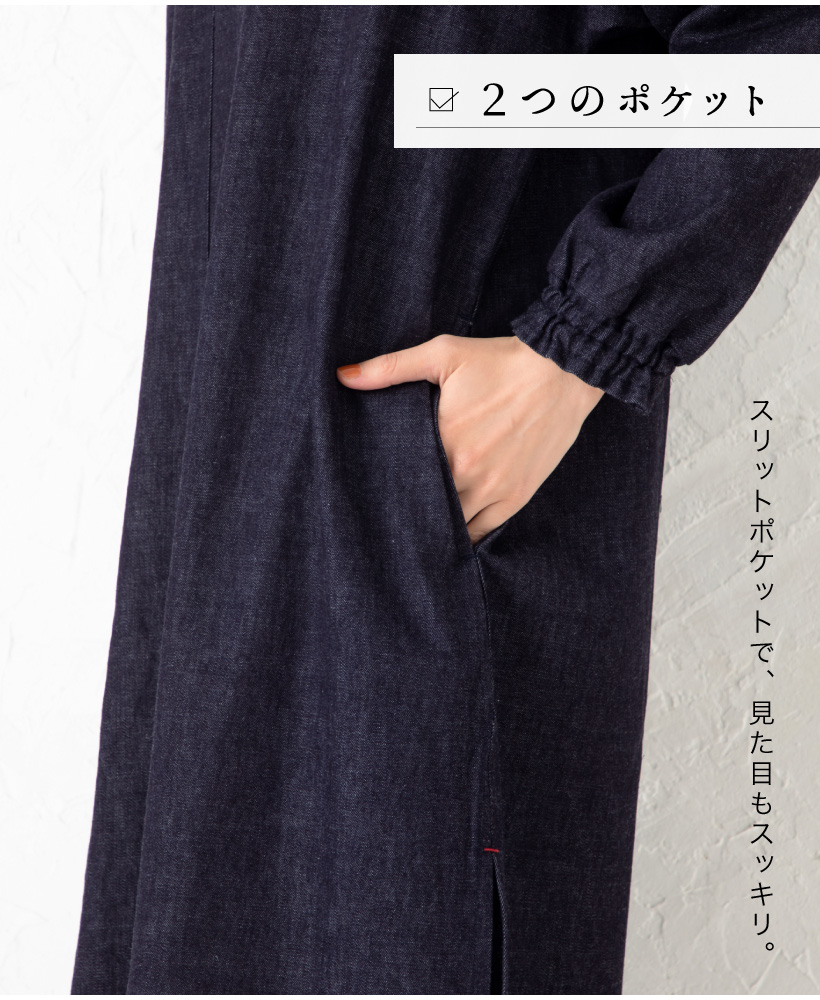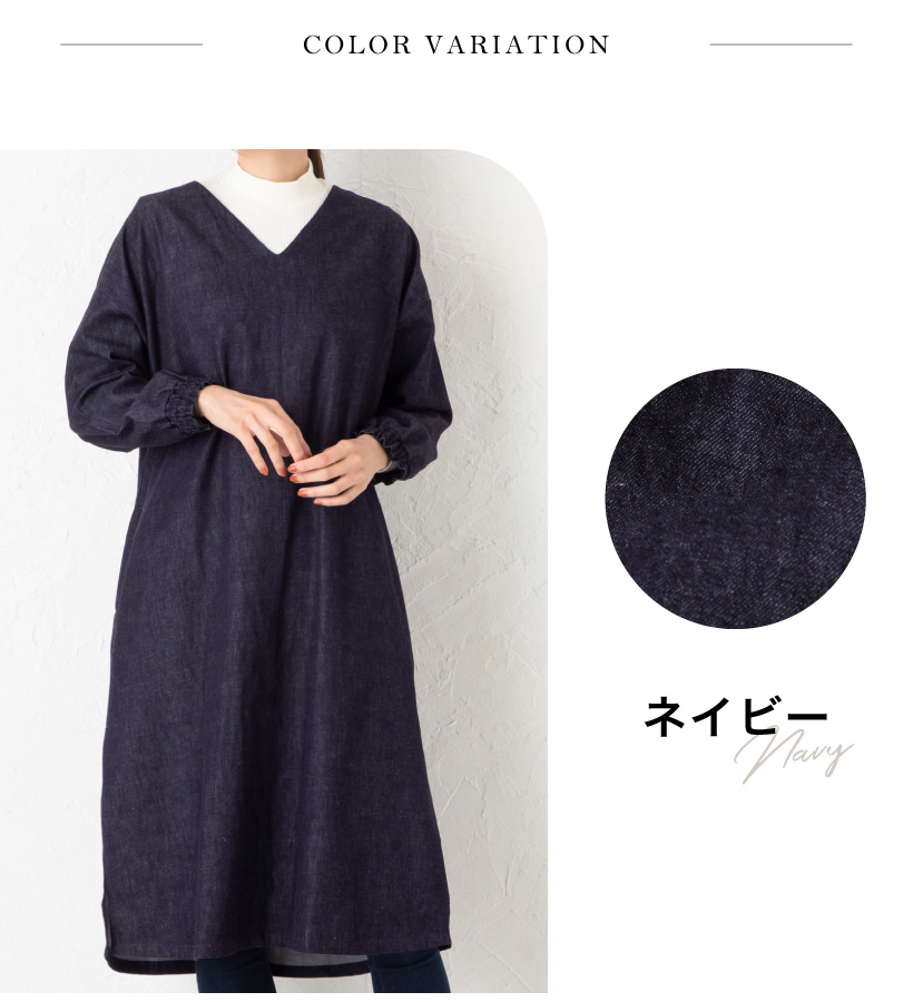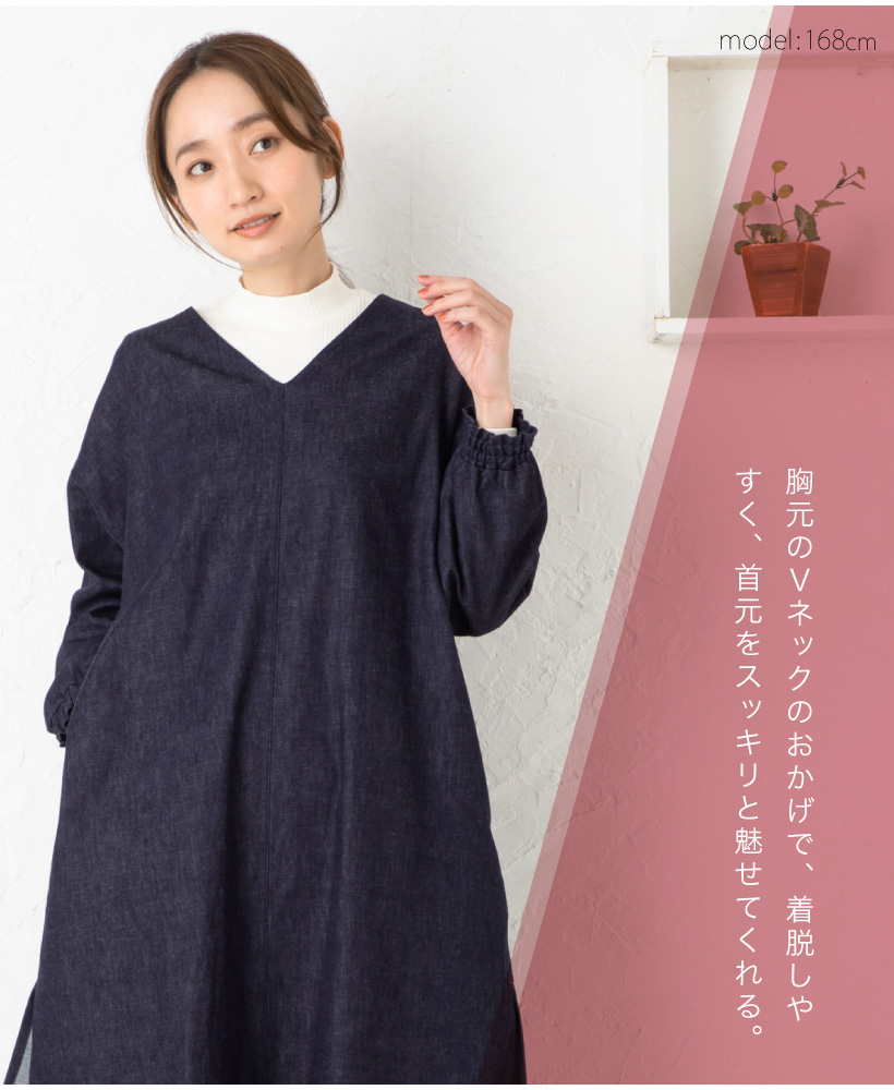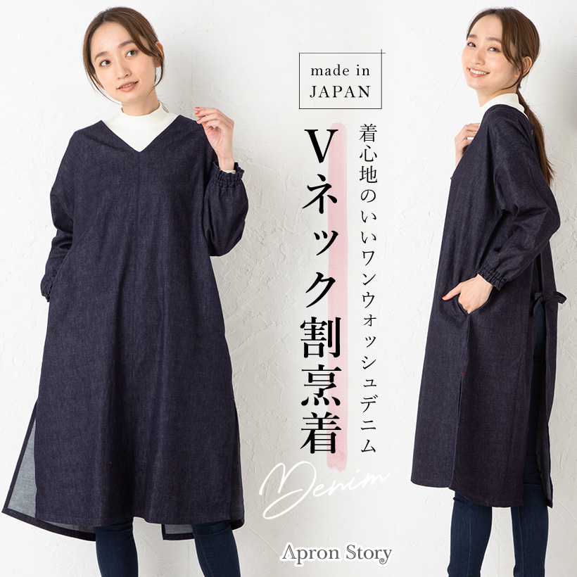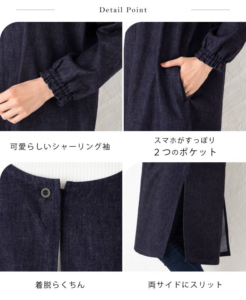 ワンウォッシュ デニム 体型カバー a0114 ネイビー 割烹着 かっぽうぎ スモック 大人可愛い シャーリング 袖ゴム 腕まくり 家事 キッチン 水仕事 おしゃれ かわいい 秋冬