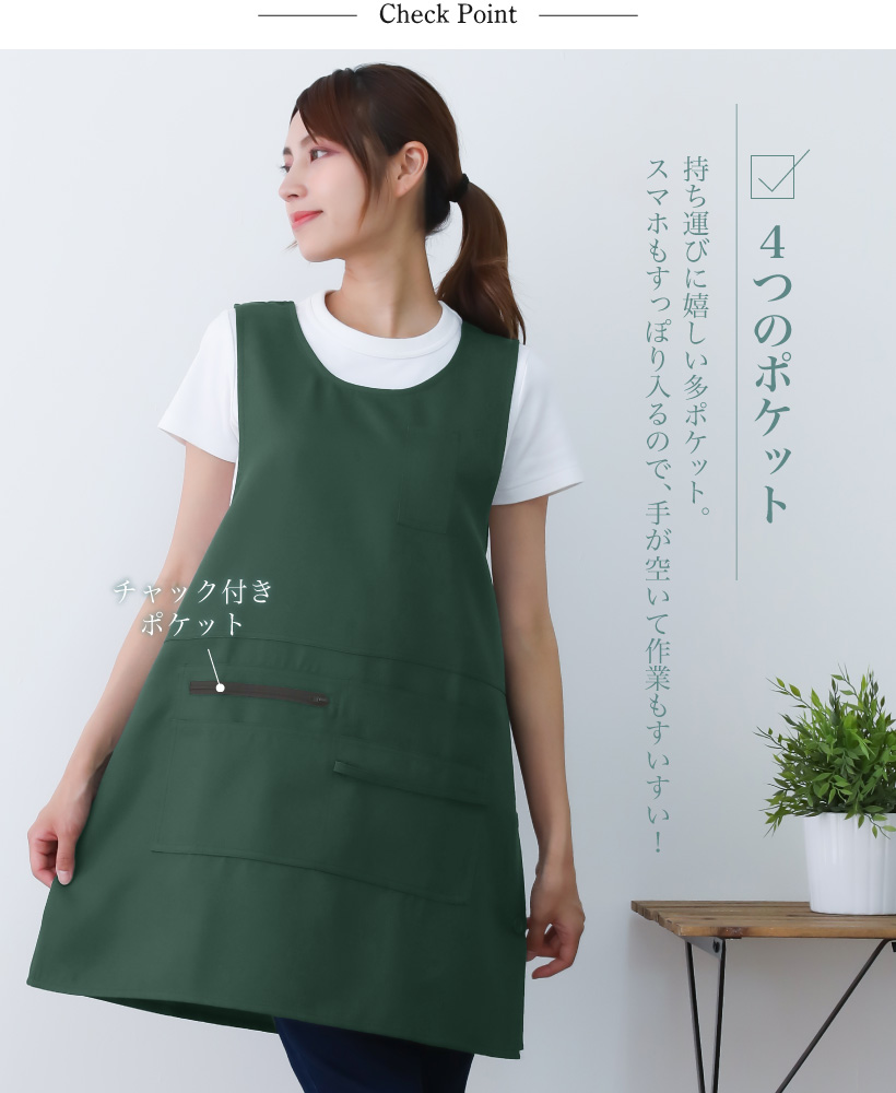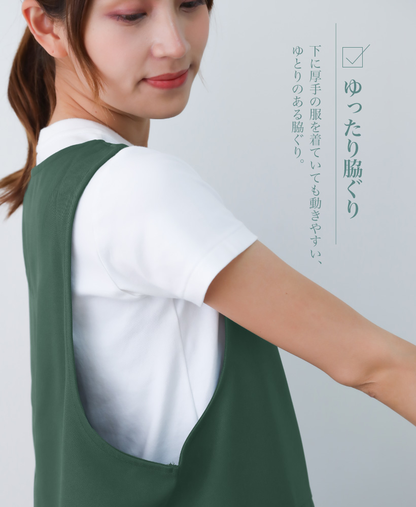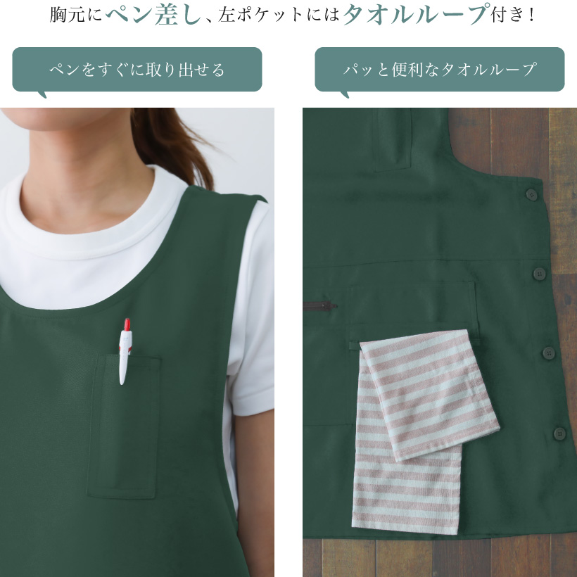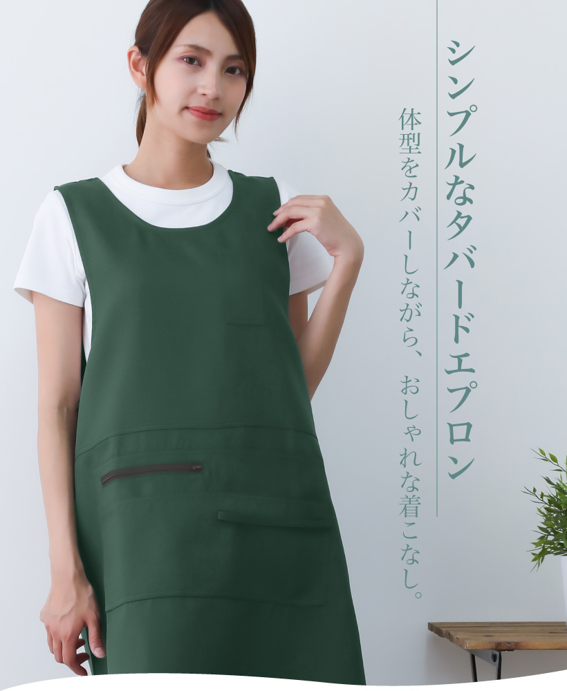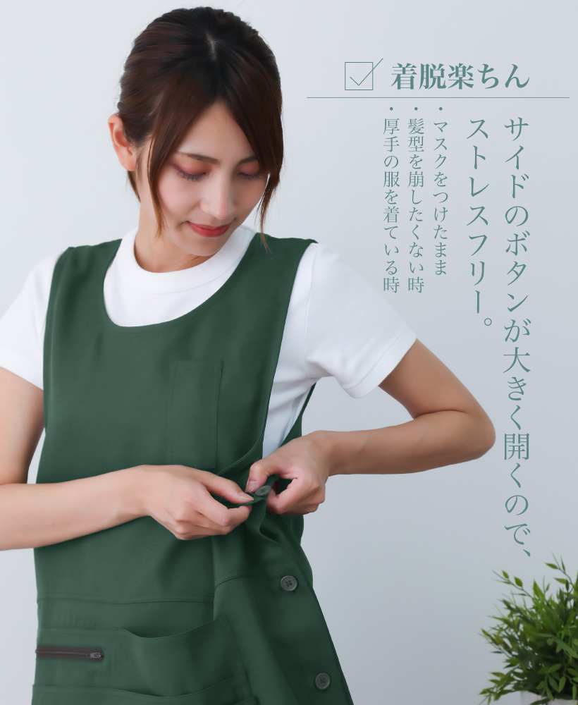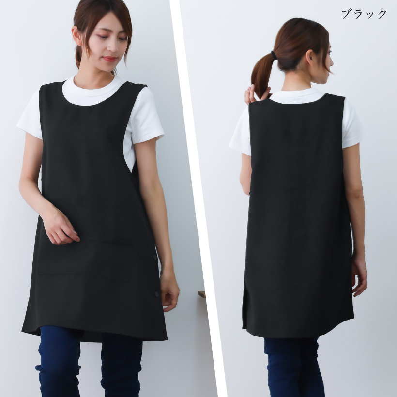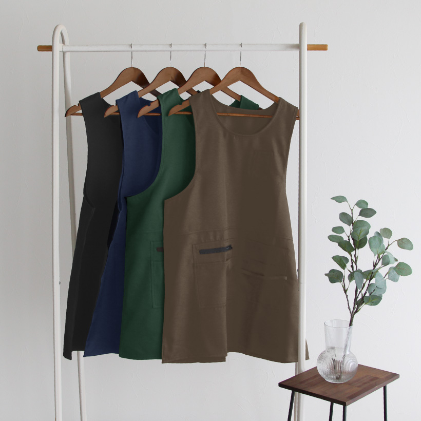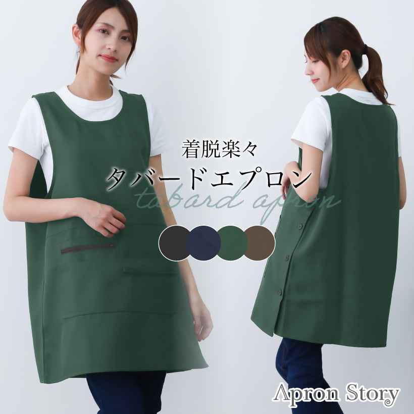 ポリエステル タバード エプロン 着脱楽々 ポケット 多ポケット ペン差し タオルループ サイドボタン 脇ボタン 速乾性 体型カバー 便利 ストレスフリー 袖なし ゆったり ラウンドネック シンプル 落ち着いた おしゃれ 無地 ひざ上 グリーン 緑 ブラウン 茶 ネイビー 紺 ブラック 黒 M L