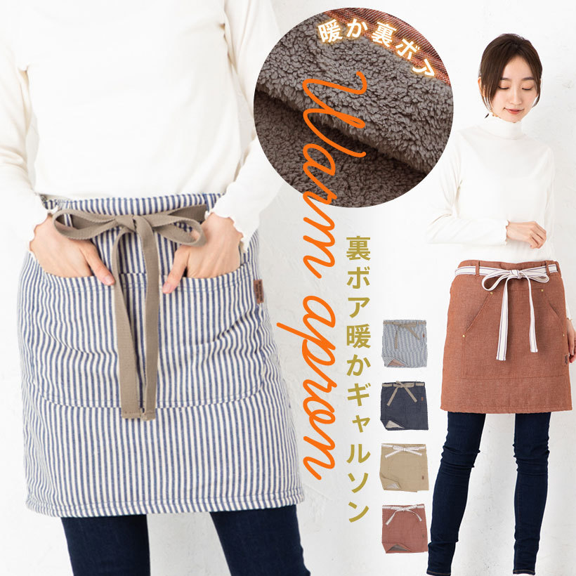 冬 秋 防寒 あったか 暖かい 温かい あたたか ふわふわ ふんわり もこもこ 裏ボア 裏起毛 起毛 ポケット 巻き 腰 ギャルソン カフェ エプロン かわいい おしゃれ カジュアル フリーサイズ レディース 女性 デニム ヒッコリー ブラウン ベージュ DIY ガーデニング gap9019 gap9021