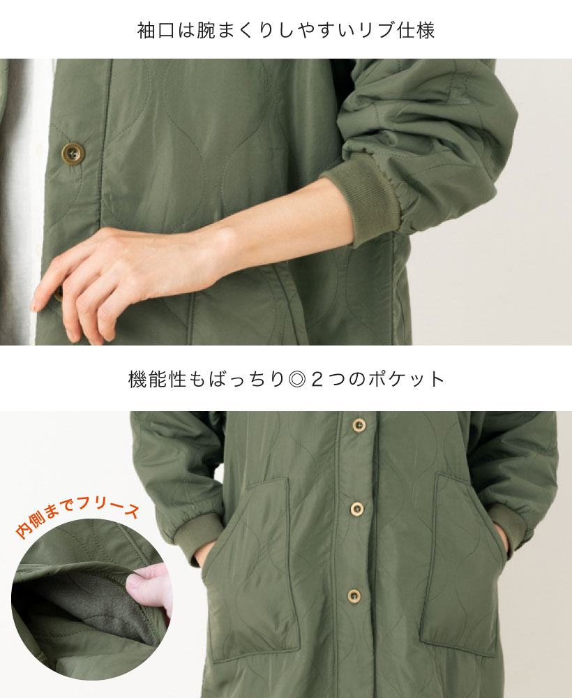 裏フリースのぽかぽかあったかエプロン!前開きタイプ、サッと羽織って着られる、ワンマイルおしゃれデザインエプロン!防寒にぴったりなキルティング素材を使用した裏フリース割烹着。寒さの厳しい秋冬のDIYやガーデニングなどにおすすめの1枚です。