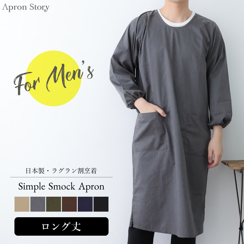 シンプルな無地デザインの男性用ロング丈かっぽう着。袖口はゴム入りで下に着た服が汚れにくく、ラグラン袖で動きやすい!。かっぽう着は、中に着た服が汚れにくいのでペットや、小さなお子様のいる家庭におすすめです。