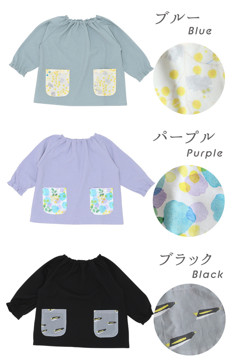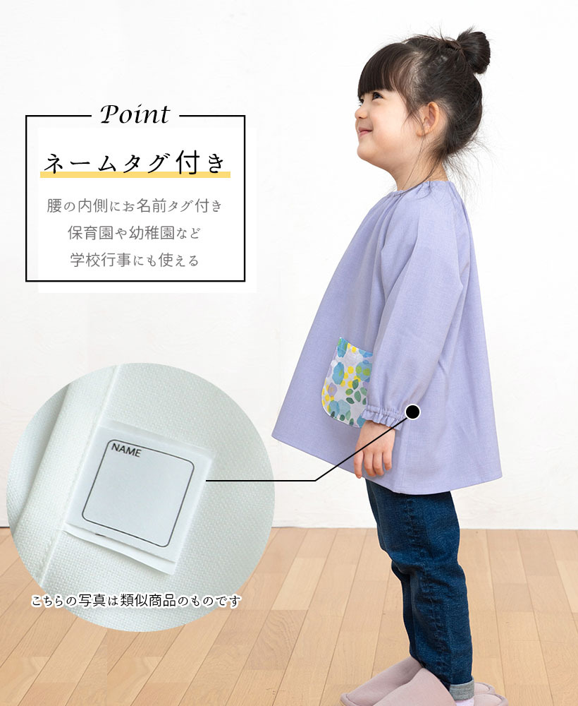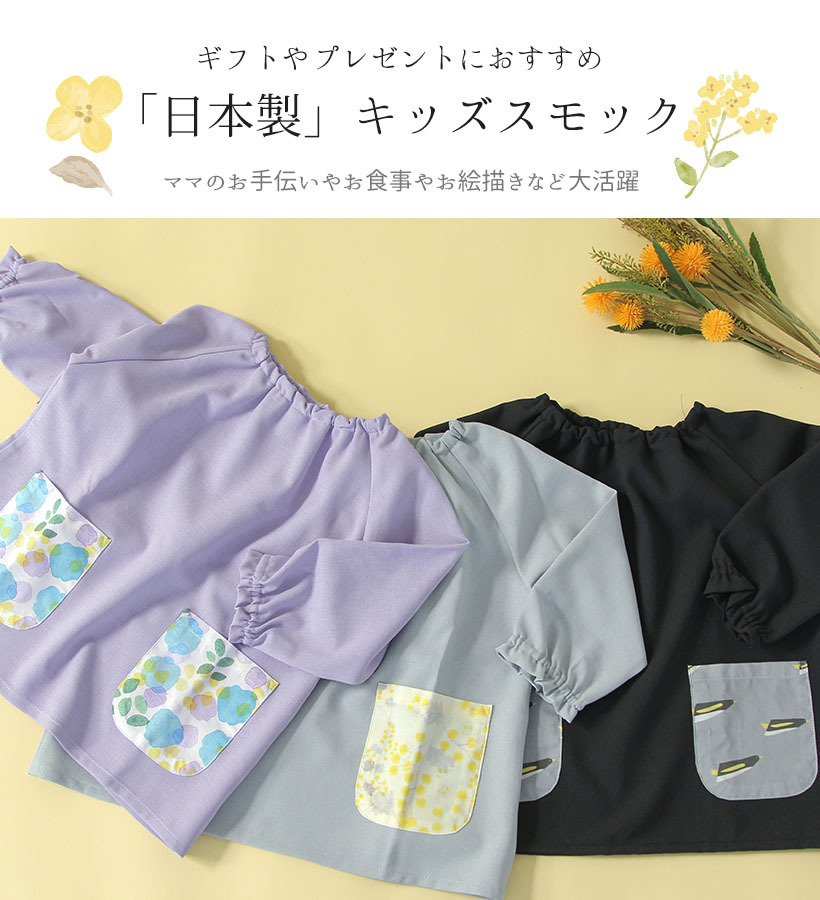 日本製 スモック キッズ こども 女の子 男の子 ネームタグ 名前タグ お祝い ギフト 入園 入学 保育園 幼稚園 習い事 可愛い おしゃれ おんなのこ シンプル 90 100 110 120 130 お絵描き 粘土遊び お食事エプロン パープル ブルー ブラック 黒 ミモザ ペンギン ノンアイロン 速乾