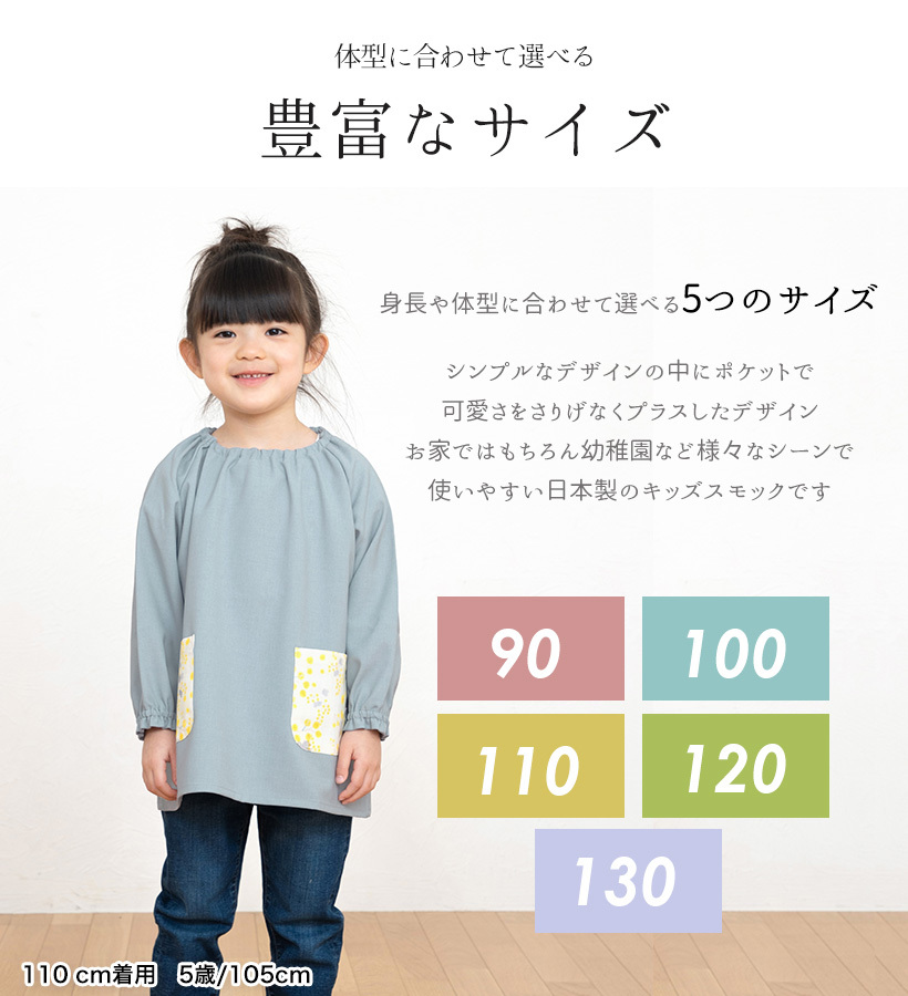 安心の日本製!汚れをきにせずママも安心ノンアイロンキッズスモック。シワになりにくいノンアイロンOKな生地でママに嬉しい!シンプルなデザインの中に可愛い柄のポケットが付いており、ゆったりとしたデザインで1人でお着替えも出来ます。お食事や粘土遊びお絵描きなど汚れを気にするシーンで大活躍!サイズも豊富な90cm〜130cmまであります!保育園や幼稚園の入園準備にもおすすめのスモックです。