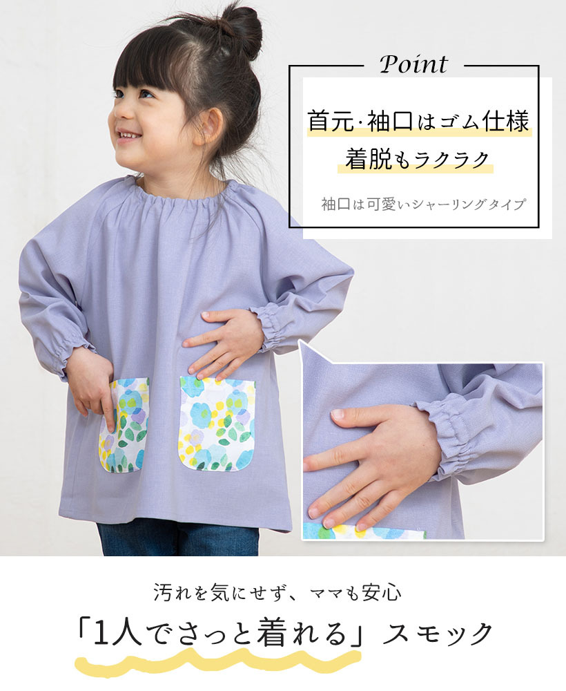 安心の日本製!汚れをきにせずママも安心ノンアイロンキッズスモック。シワになりにくいノンアイロンOKな生地でママに嬉しい!シンプルなデザインの中に可愛い柄のポケットが付いており、ゆったりとしたデザインで1人でお着替えも出来ます。お食事や粘土遊びお絵描きなど汚れを気にするシーンで大活躍!サイズも豊富な90cm~130cmまであります!保育園や幼稚園の入園準備にもおすすめのスモックです。