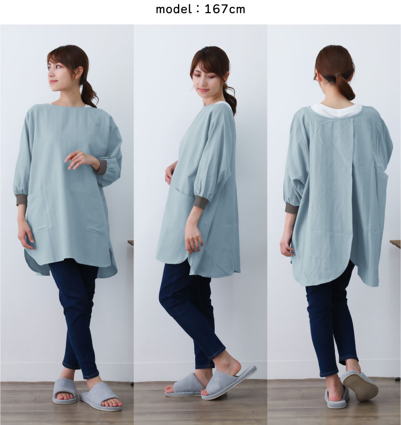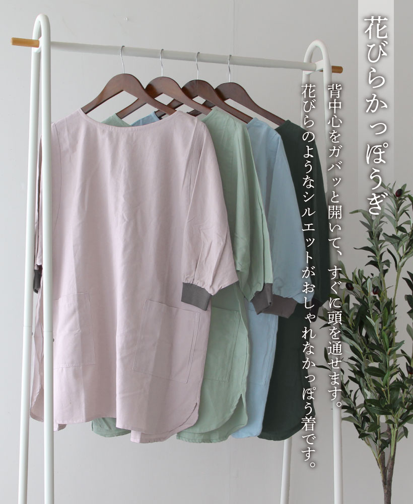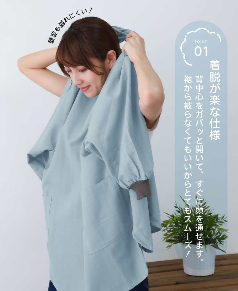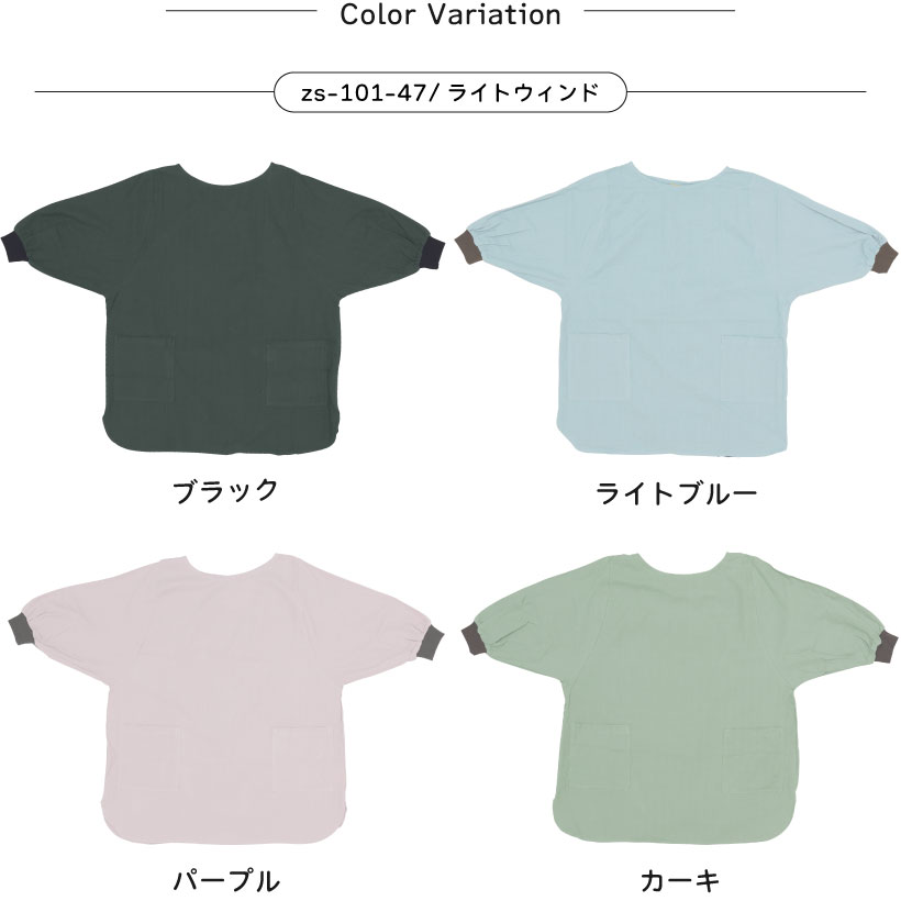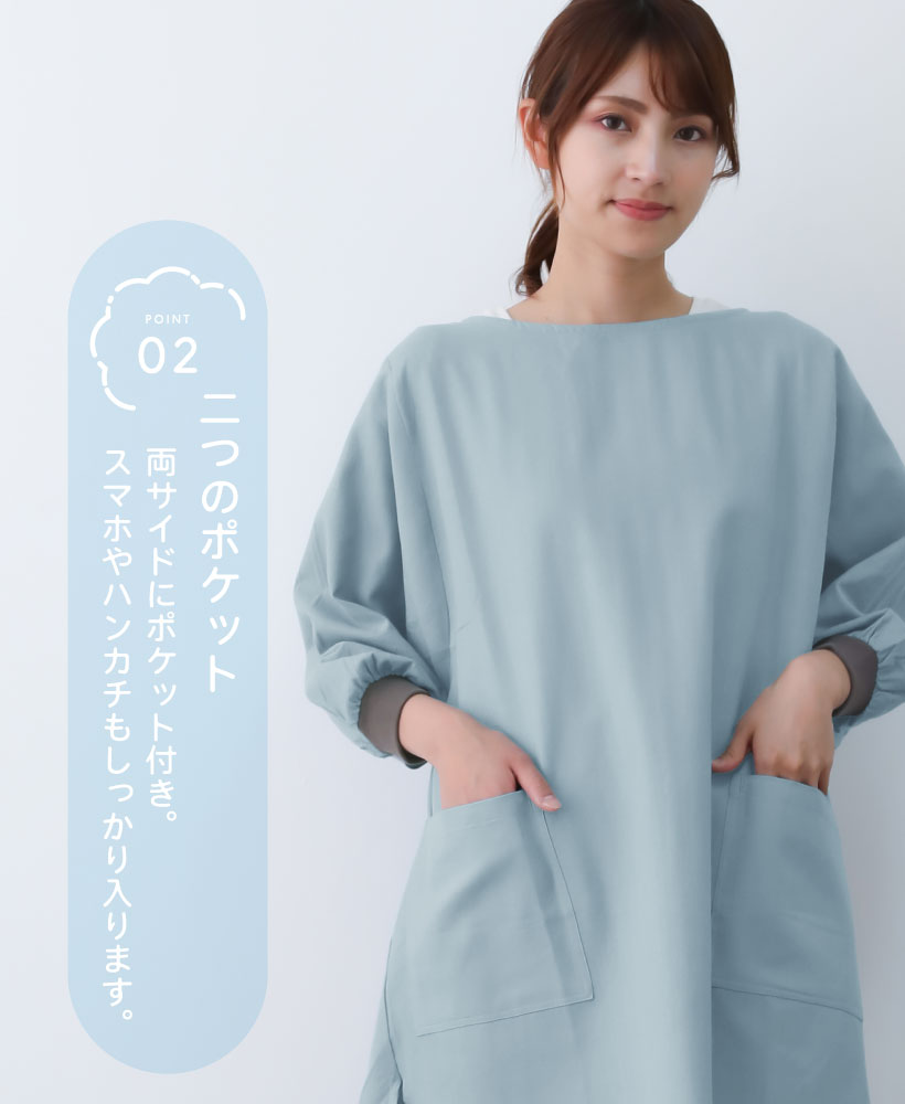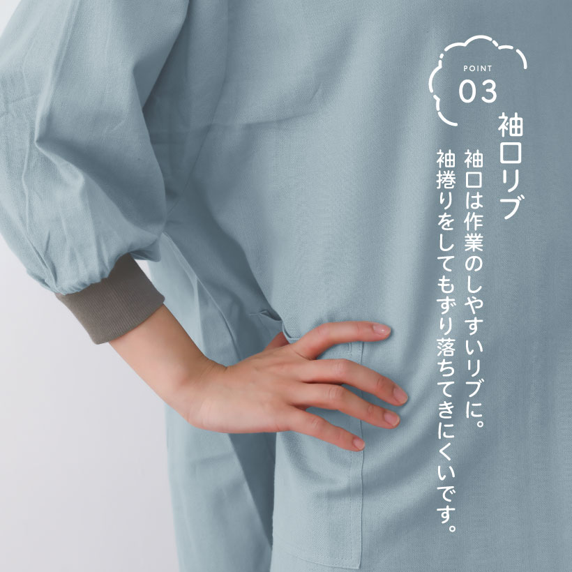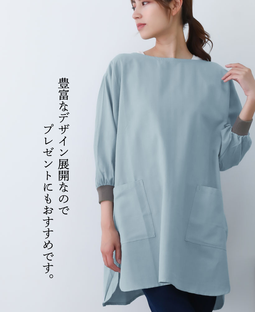 綿 麻 割烹着 かっぽう着 花びら リブ リブ袖 かぶるだけ 着脱簡単 ポケット 通気性 ライトウィンド ブラック 黒 ライトブルー 水色 パープル 紫 カーキ 緑 ゼファー ナチュラル ネイビー 紺 グリッド グレイ 灰 大人ナチュラル かわいい 落ち着いた おしゃれ 大人 無地