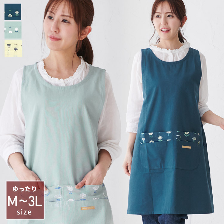 M〜3Lサイズ ワンポイント花柄エプロン ワンピース エプロン ゆったり 綿 コットン シンプル ロング ワンピースエプロン 脇ボタン 保育士 おしゃれ かわいい 母