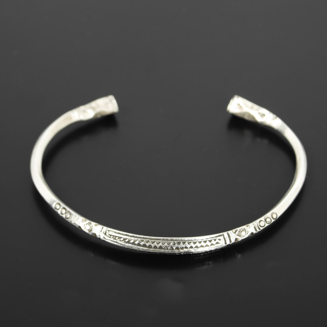 TOUAREG/TUAREG SILVER JEWELRY【トゥアレグ シルバー ジュエリー】のバングル。フリーサイズです。鏨(たがね)という特殊な道具で一点一点彫を入れて作られています。一つでも存在感のあるジュエリーですが意匠の違うものを重ねてつけるのがおすすめです。美しいトゥアレグ族のシルバー。伝統的な柄が手彫りによって施されたデザイン。中央が太くなっており先端に独特な意匠がほられています。一番太いところで6ミリぐらいの細いバングル。使いやすい程よいデザインで色々なコーディネイトによく合います。ニジェールのとても一般的なトゥアレグの工房で作られたものです。現地のいろいろなところで銀を仕入れて作られています。銀の産地で有名なニジェールですが土着な工房で不純物も混ざる味のあるジュエリ−です。男女問わずお使いいただけます。