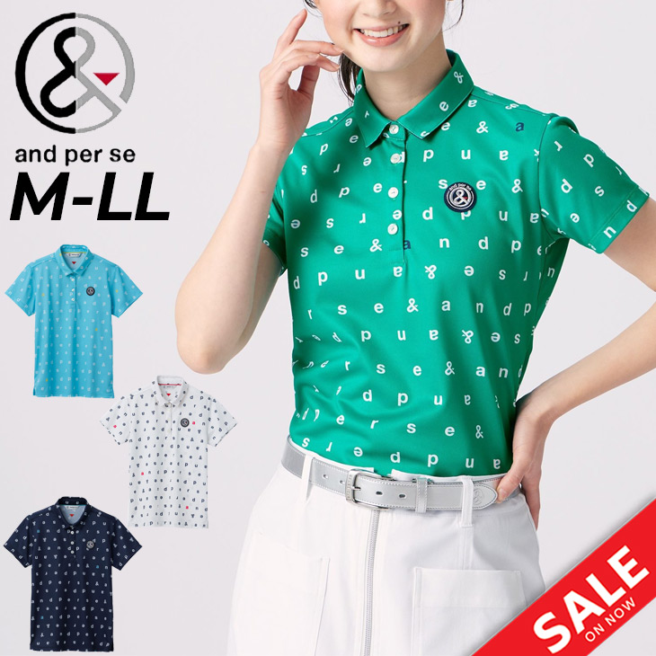 アンパスィ 半袖 ポロシャツ レディース ゴルフウェア and per se 総柄プリント 半袖共衿シャツ 鹿の子ポロ 吸汗速乾 UVカット ゴルフシャツ 女性用 /AFS9613P3