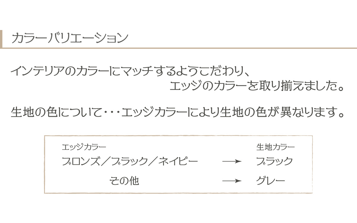 縁カラーがブロンズ・ブラック・ネイビーの場合は、生地のカラーは「ブラック」となります。