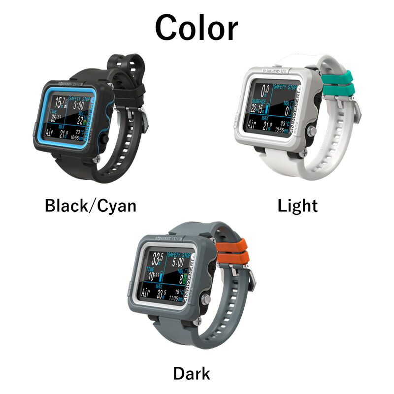 | 同梱物 | ・Peregrine ダイブコンピューター ・USB-Cワイヤレス充電器 ・点検チェックリストカード ・製品情報ガイド ・スクリーンプロテクター ・26mm シリコンショートストラップ ・ブラック/シアンモデルには、長いブラックストラップとブラックショックコードが含まれます。 ・アドベンチャーズ・エディションLight(ライト)とDark(ダーク)には、色を合わせたショートストラップとショックコードが含まれています。 |