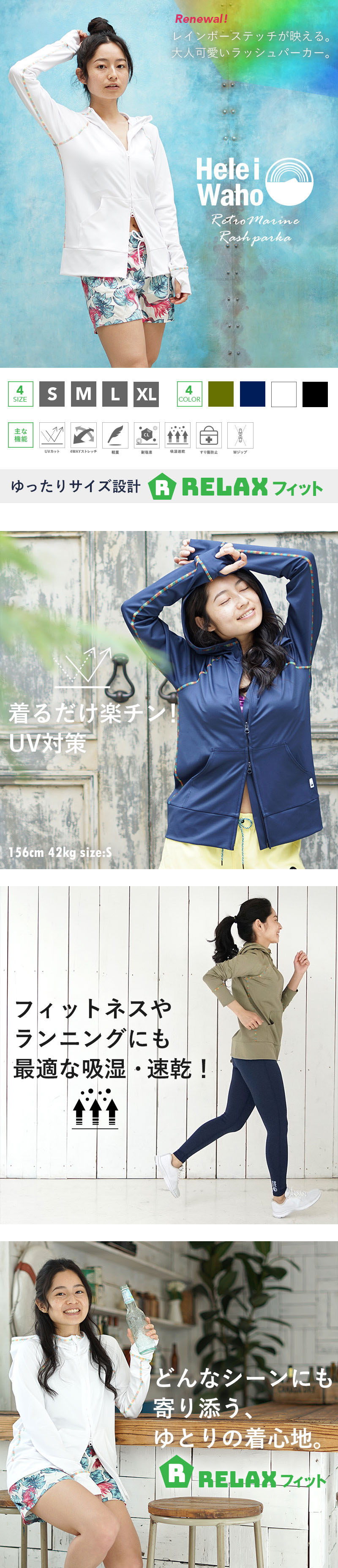 | ■商品名 HeleiWaho リラックスフィット ラッシュパーカー(レインボーステッチ) ■商品説明 着るだけ、カンタンUV対策。 海も街も、そのまま使える水陸両用ラッシュパーカーです。人気のリラックスフィット設計をベースに、さりげなく映えるレインボーステッチをプラス。 シンプルすぎない、大人カジュアルな一枚に仕上げました。ゆったりとしたシルエットで体型を自然にカバー。 ハイネック仕様で首元まで守り、サムホール付きで手の甲まで紫外線対策が可能です。 さらにWジップ仕様により、着こなしのアレンジも自在。下から少し開けることで抜け感をつくり、スタイルアップ効果も狙えます。 海上がりのカフェや旅行先でも違和感なく着られる、“水辺専用で終わらない”ラッシュパーカーです。 ■主な機能 ・UPF50+(紫外線遮蔽率99%以上) 首元から手の甲までしっかりガード。 ・吸水速乾 濡れても重くなりにくく、乾きやすい。 ・耐塩素加工 プール使用や洗濯でも劣化しにくい。 ・4WAYストレッチ ゆったり設計でも動きやすい。 ■リラックスフィット設計 身体のラインを拾いすぎない、ややゆとりのあるシルエット。ラグランパターンで肩まわりを自然に見せ、二の腕もすっきり。 ハイネック仕様で首元までしっかりカバー。縦ラインを強調する設計で、着るだけでバランスよく見える仕上がりです。フードは深め設計。帽子の上からでも被りやすく、日差し対策にも安心です。 ■ディテール ・レインボーステッチ仕様 さりげないアクセントで差がつくデザイン。 ・Wジップ(YKKファスナー採用) 上下開閉可能で着こなし自在。 ・ポケット付き 日常使いにも便利。 ・ファスナーガード 顎への当たりを軽減。 ・内側オーバーロック縫製 縫い目が目立ちにくく、街着としても自然。 ・透けにくい6oz厚手生地 水に濡れても安心感のある着用感。 ・水陸両用設計 海も街もこれ一枚で対応。 ■ラッシュガード生地の強み 素材:ポリエステル93%/ポリウレタン7%(6oz) 厚みがあり透けにくい設計。水に濡れてもダラっと伸びにくく、美しいシルエットをキープします。一般的な薄手UVパーカーとは違い、水辺での使用を前提に設計された安心仕様です。 ■使用シーン 海水浴/プール/シュノーケリング 旅行/リゾート/フェス キャンプ/釣り/公園遊び ランニング/ウォーキング 冷房対策/日常の紫外線対策 水辺から街まで、幅広く活躍します。 ■こんな方に ・体型を自然にカバーしたい ・シンプルすぎないデザインを選びたい ・透けにくいパーカーを探している ・海も街も一枚で済ませたい ・着こなしを楽しみたい 露出を抑えながら、きれいに見せたい方におすすめです。 ■仕様 スタイル:レディース タイプ:パーカー(リラックスフィット/Wジップ仕様) サイズ:S/M/L/XL 素材:ポリエステル93%/ポリウレタン7% 紫外線カット率:99%以上(UPF50+) |