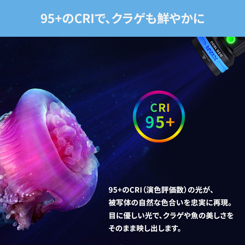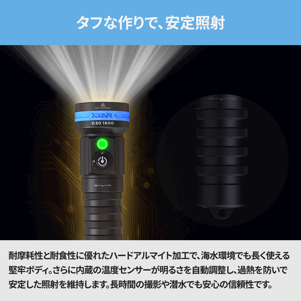 | D30 1600 (w/o BT, Charger) ブランド:XTAR (エクスター) ハイパフォーマンス・エレクトロニクスブランドで、リチウムイオン電池、充電器やLEDライトで広く知られてます。 スキューバダイビング業界では高性能なダイブライト(水中ライト / ダイビングライト/ 水中カメラ用ライト)のメーカーとしても注目され、日本国内ではVAPE(電子タバコ)用をはじめとする充電器・電池の品質と性能に定評があります。世界130カ国以上で実績を持ち、当社は正規代理店として販売しています。 < 本体サイズ > (先端直径 )46mm / (底直径 )33mm 全長:146mm < 重量 > 230g (バッテリー含まず ) < 材質 > 高強度アルミニウム合金 (耐腐食性に優れたハードアルマイト加工 ) < 最大光量 (ルーメン ) > White High:1600ルーメン White Mid :800ルーメン White Low :400ルーメン Red :260ルーメン Blue:130ルーメン UV :6W < 連続点灯時間 > White High:約2時間 White Mid :約3時間 White Low :約6時間 Red/Blue/UV:約3時間 ※ 26650 リチウムイオン電池 (5200mAh ) 使用時 < 照射距離 > 最大40m (陸上 ) < 照射角 > 130° (ワイドビーム ) < 耐圧深度 > 水深100m (IPX8等級 ) ※水中では、浮遊物などによる透明度によって短くなります。 < 耐衝撃性 > 1.5mまでの落下テスト済み < LED > Cree XHP35-HI / XP-E2 < 演色性 (CRI ) > 95+ < 対応電池 > ※別売り ・3.6V 26650 Li-ion 5200mAh / リチウムイオン電池 ・3.6V 18650 Li-ion 3500mAh / リチウムイオン電池 (アダプター/スペーサー: 付属 が必要) ※必ず、XTAR のバッテリーをご使用ください。 ※当社が取扱うXTARリチウムイオン電池は全てPSE取得済。 < スイッチ方式 > マグネット式プッシュボタン (ロック機能付き ) < 付属品 > 水中ライト 本体 / ランヤード / スペアOリング(2個) / 18650 Li-ion電池用スペーサーチューブ / 取扱説明書 (日本語表記あり) ※電池、充電器(チャージャー)は別売りとなります。 < 製品保証 > ・ライト:ご購入後2年間 ※初期不良や説明書に記載の内容のご対応となります。 < 正規製品証明 > パッケージに記載されている偽造防止ラベルのコーティングを削り、18桁の偽造防止コードを取得します。取得したコードは、説明書記載の手順に従って正規品の確認が可能です。 |