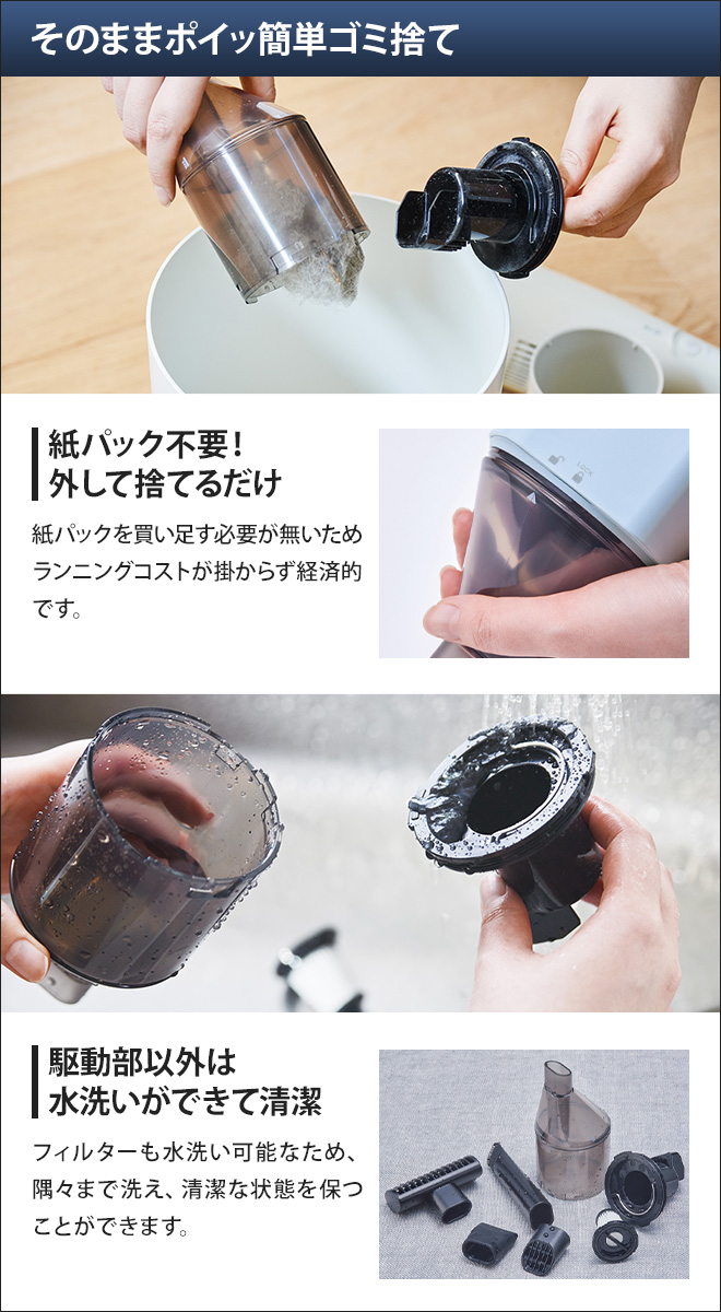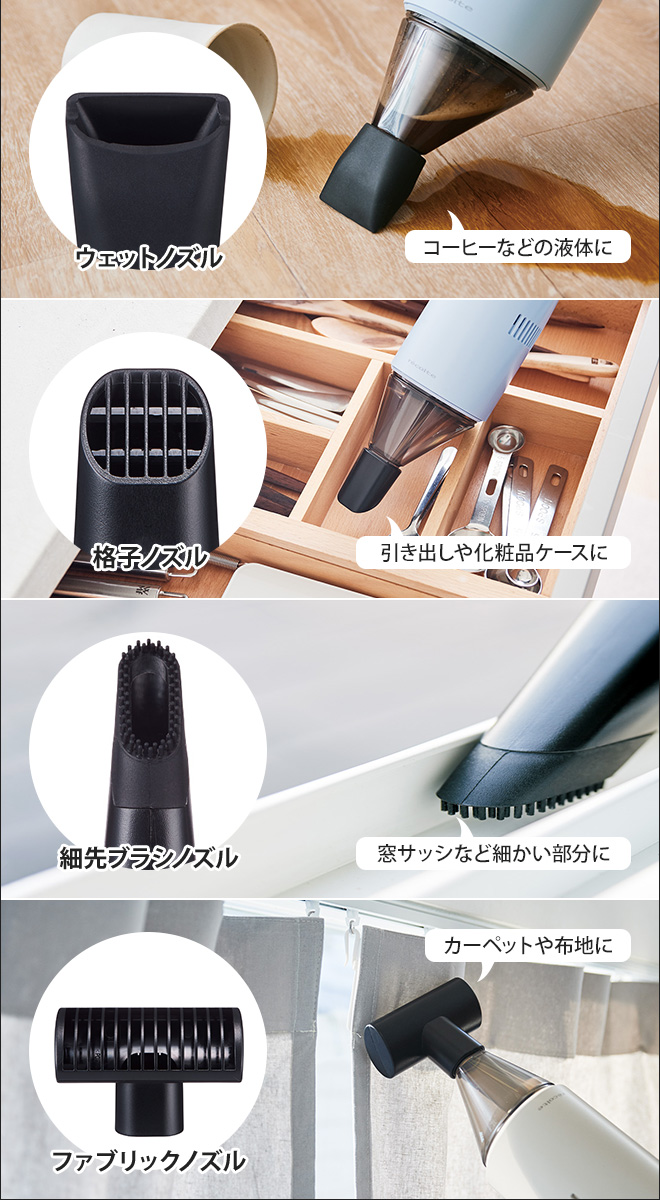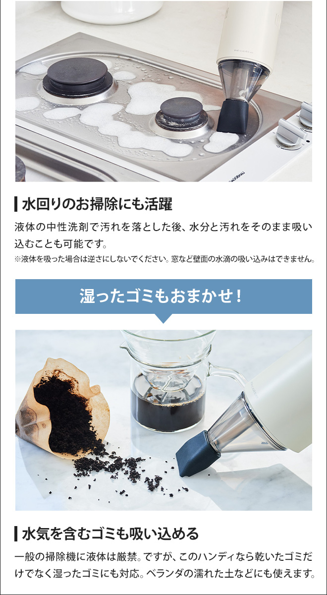 乾いたゴミや埃はもちろん、水も吸えるので、使用場所を選びません。