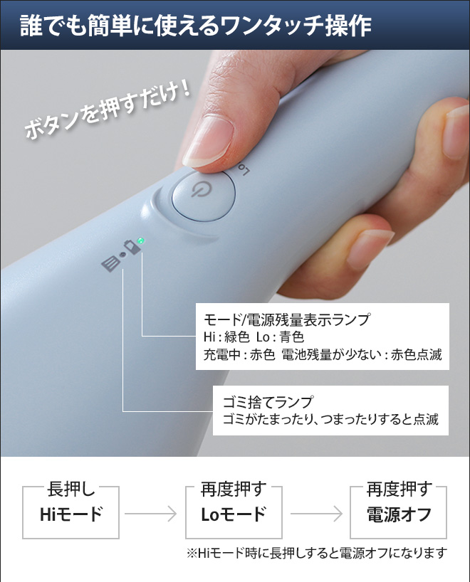 | 注意 | ・初めて使うときは、一度満充電にしてからご使用ください。充電をはじめる前に必ず運転を停止してください。充電中は運転できません。長期間使用しない場合は、3ヶ月に一度を目安に充電してください。 ・液体を吸った場合は、ダストボックスを逆さにしないでください。 |