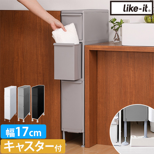段差があっても設置できるlike-it アジャスター付きトールストッカー。幅17cmとスリムだからキッチンや洗面所のちょっとした隙間にフィット!高さ調節可能なアジャスター付きで洗濯機の下の防水パンなどの段差をまたいで設置できます。ものの出し入れがしやすい引き出し式で、中身は見えないのでスッキリ収納できます。キャスター付きで移動がしやすいのも嬉しい。