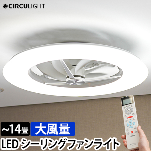 LEDライトとファンが一体になった[ サーキュライト シーリングライトサーキュレーター 大風量モデル 14畳用 ]。シーリングライトに大風量サーキュレーター機能をプラスし、省スペース、効率的な空気循環を実現!薄型スリムなので、圧迫感を抑えて設置できます。DCモーターで静音、省エネ。ライトは明るい5400lm、調光調色にも対応。オフタイマーつき、リモコンも付属します。