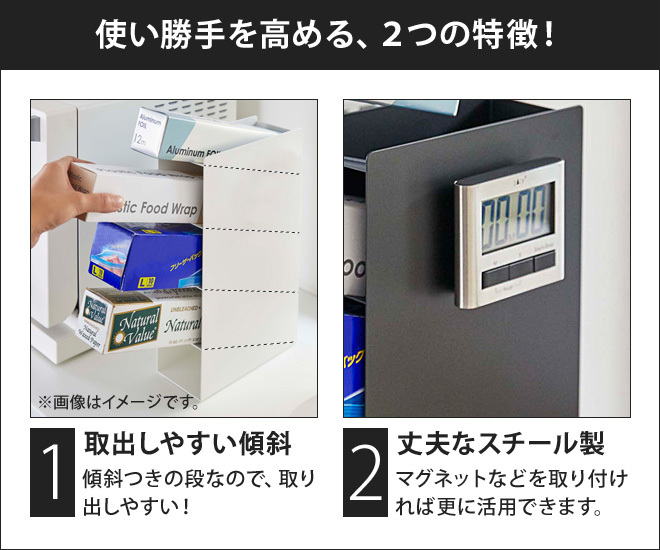 ラップやホイルって、意外と置き場所に困るものですよね。よく使うものなので、取り出しやすい位置と高さにあるというだけでお料理もスムーズにできそうな気がします。