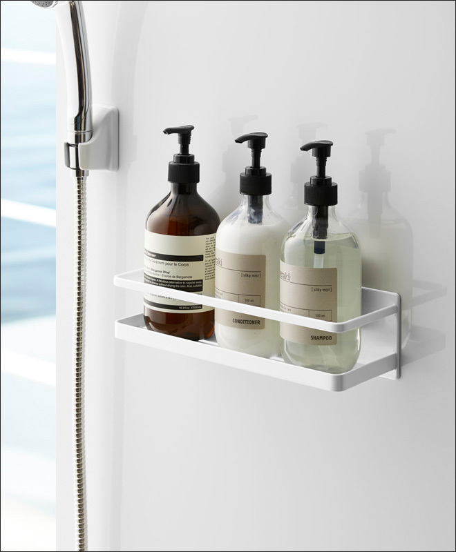 AQUAでは数多くのマグネットでくっつくバスルーム収納を取り扱っていますが、こちらのラックはディスペンサーボトルの置き場所にピッタリのサイズ!