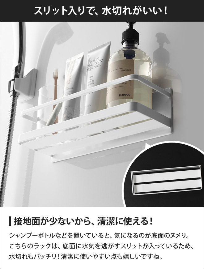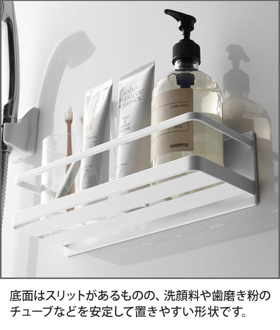 水はけ用のスリットが入っていますが底面自体は広いので、トリートメントや歯磨き粉などのチューブ類やミニボトルなどもぐらつかず置ける点も嬉しいポイント。