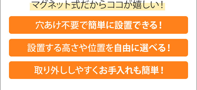 | 取付可能な壁面 | マグネットがつく平らな面・スチール壁面 |