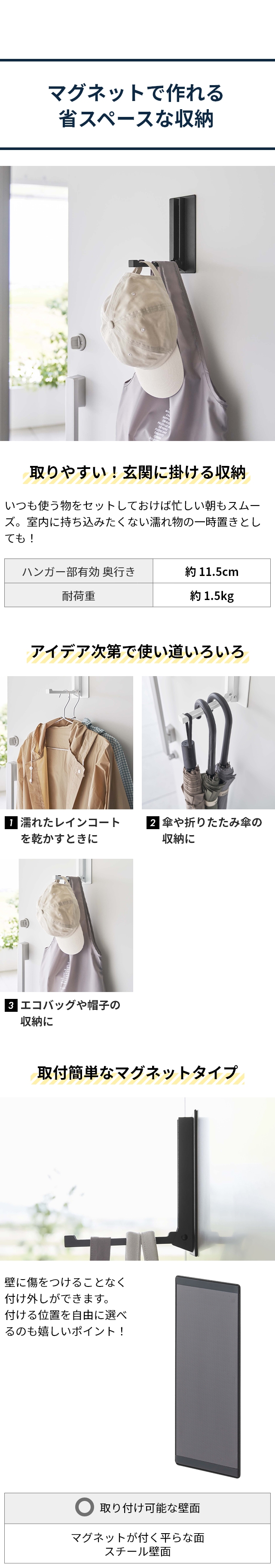 | 取り付け可能な壁面 | マグネットがつく平らな面、スチール壁面 |