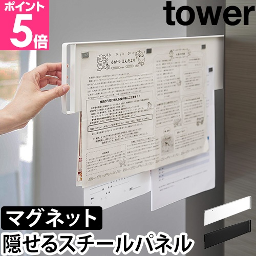 生活感が出がちな学校プリントやチラシなどを、隠して収納できる「tower マグネット冷蔵庫横隠せるスライドスチールパネル」。冷蔵庫横のデッドスペースに、マグネットで簡単に設置できます。