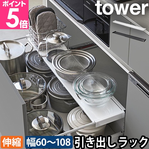 深さがあって全ての空間を活用しにくいシンク下に、小物をたっぷりできる収納スペースを追加してくれるのが、「tower (タワー) 伸縮キッチン引き出し中ラック ワイド」。設置方法は引き出しのサイドバーに引っ掛けるだけ。幅60〜108cmまで伸縮するので、自宅の引き出しにピッタリフィット!引き出しが2段になり、ストック食品やキッチン小物を上手に収納することが出来ます。