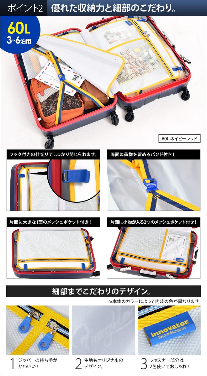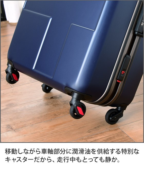 | 機能 | ・4輪キャスター ・フレームタイプ ・グリスパックキャスター(移動中、車軸に潤滑油を供給) ・走行音が1/2に ・TSAロック付属(カードキータイプ) ・固定バンド付き ・ポケット付きの仕切りあり ・持ち手×2(上部、側面) ・4段階伸縮ハンドル |