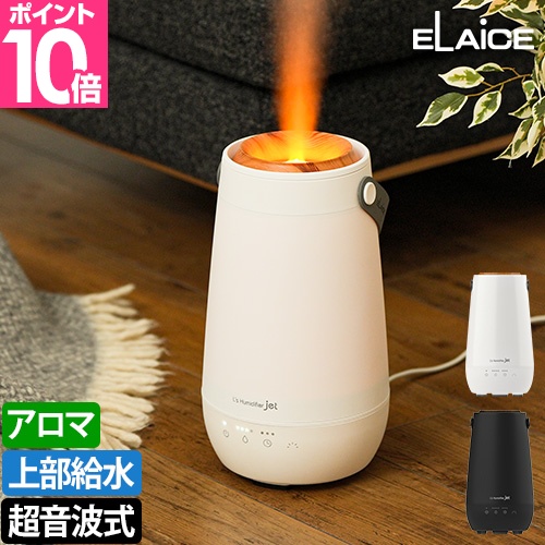 超音波によりミストがすぐ出てお部屋を潤せる、エレス 超音波式加湿器 エルズヒュミディファイア ジェット。上部給水の2.4Lタンクをもち、弱運転で約24時間使えます。抗菌カートリッジ付属で雑菌の繁殖を抑制、タンクや部品は取り外してお手入れ簡単。2/4/6時間のオフタイマーなど、タッチパネルで操作可能。LEDの光が癒されるデザインが特徴です。
