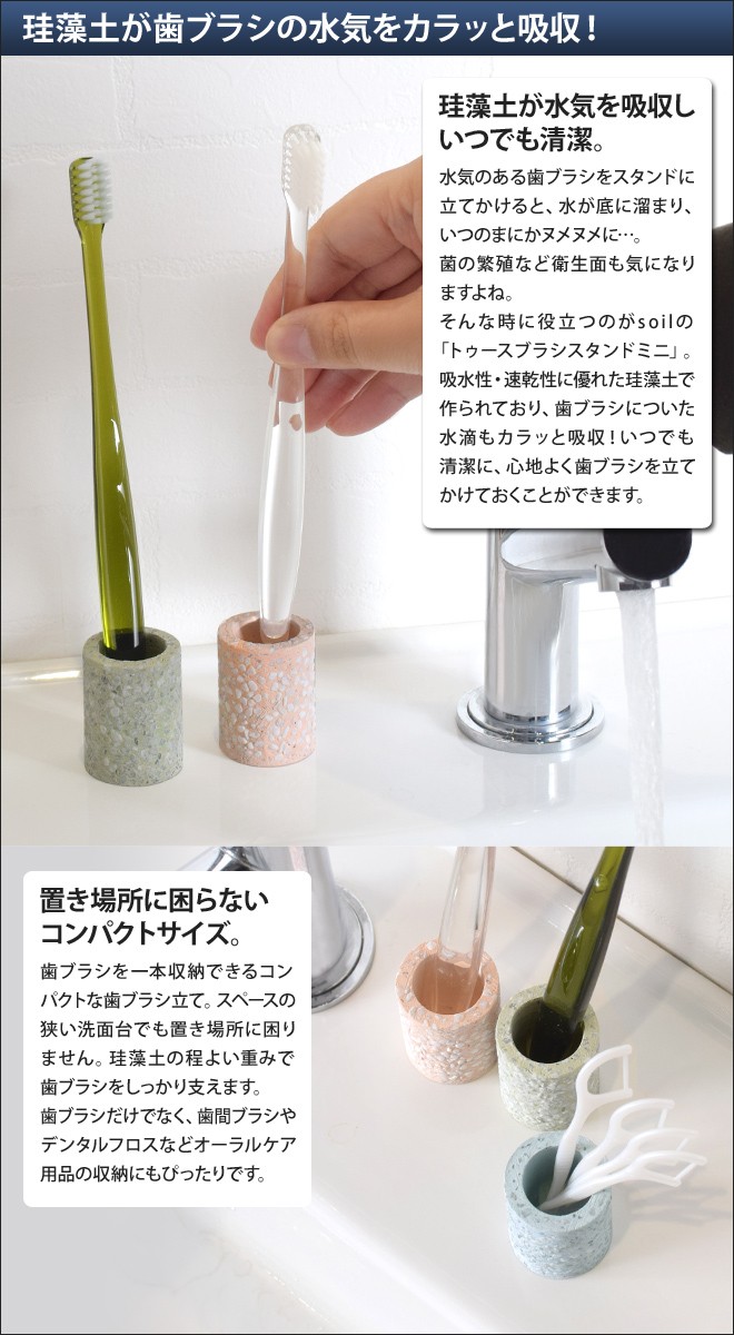 soilの歯ブラシスタンドは、吸水性や速乾性に優れた珪藻土を使用。歯ブラシについた水滴もカラッと吸収するのでいつでも清潔です(^^)
