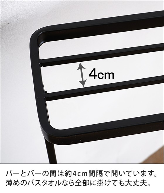 バーは4cmの隙間があり、バスタオルなら4枚、下段にバスマットを1枚干すことができます。