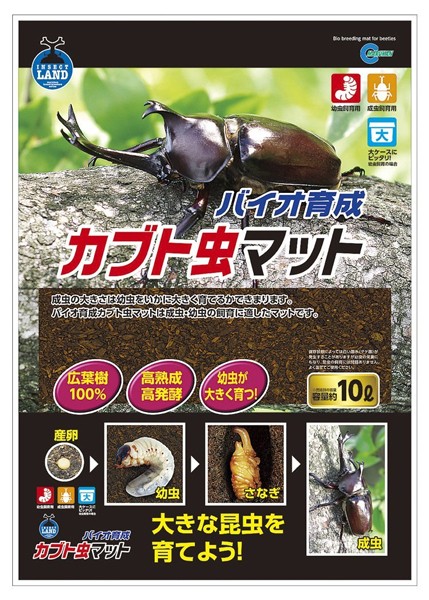 広葉樹100%:広葉樹は幼虫が好んで食べ、保水性・通気性にも優れています。・高熟成・高醗酵ですからマットの中の温度が安定し、幼虫の飼育環境を安定させます。・成虫の大きさは幼虫をいかに大きく育てるかで決まります。「バイオ育成カブト虫マット」は幼虫・成虫の飼育に適したマットです。