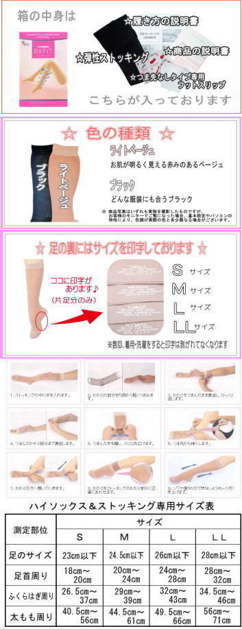 ストッキング:足のサイズ、足首の周径(最も細い)、ふくらはぎの周径(最も太い)、大腿部の周径(股下5cm)