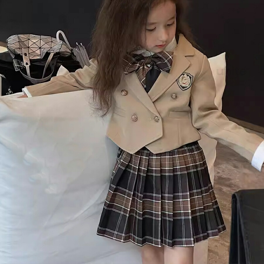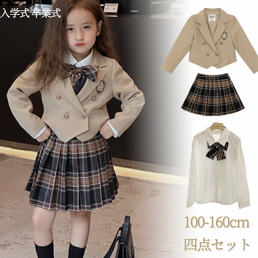入学式 スーツ 女の子 4点セット 卒園式 スーツ 女の子 長袖 セットアップ フォーマルスーツ 卒業式 子供 ジャケット チェック柄スカート リボン 上下セット 小学生 卒園式 七五三 撮影 発表会 子供 フォーマル