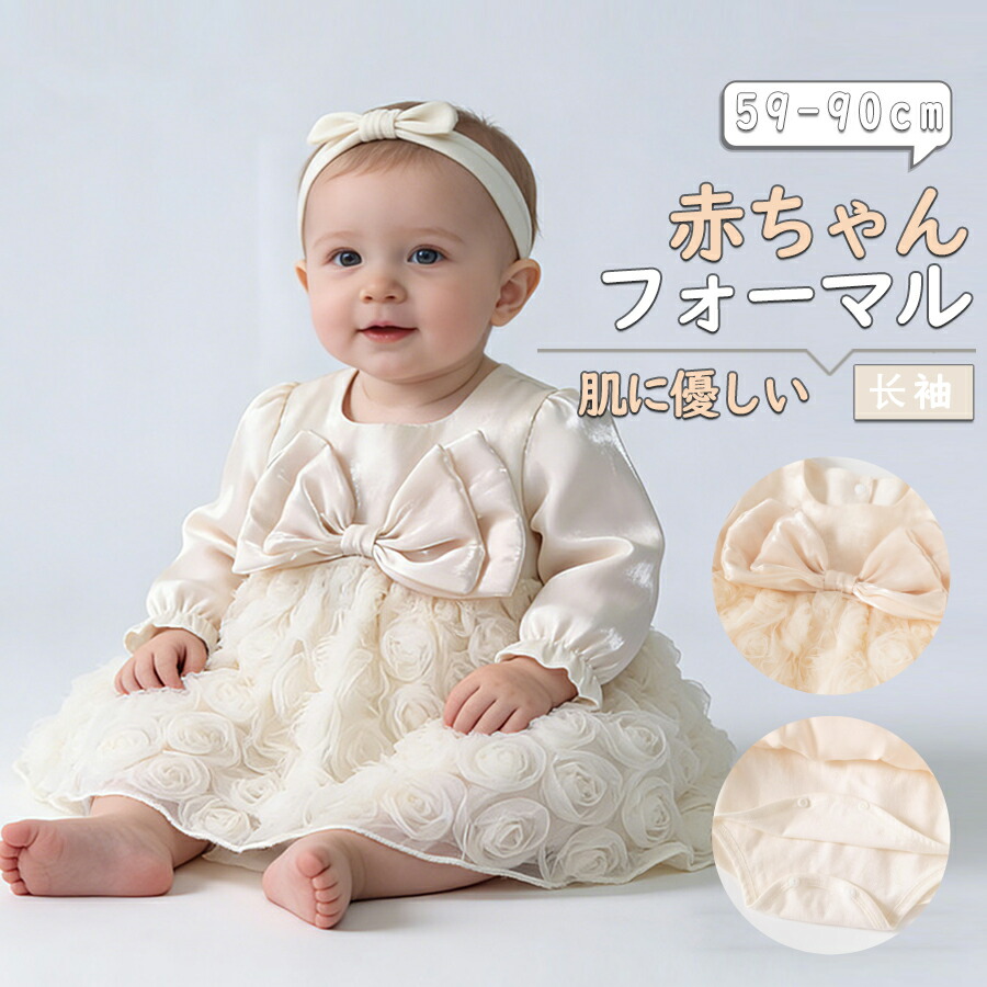 ベビードレス 長袖 ベビー ロンパース ワンピース リボン付き ベビーワンピース 巻きバラ ドレス ベビー 入園式 卒園式 お宮参り 赤ちゃんドレス