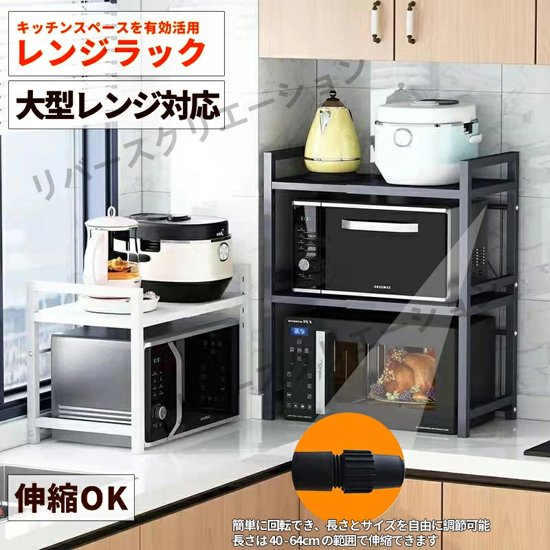 電子レンジ上のデッドスペースを有効活用できる伸縮キッチンラック:レンジ上ラックは、約幅36cm〜64 cm(内寸)で無段階調整できる。レンジの大きさや収納物の量、置く場所の広さなどに合わせたご家庭のキッチンにちょうどいい形で設置していただけます。サイドバーを6個s字フックなどを使用した吊り下げ収納に使えます。レンジラックとして使えるし、洗面台の下の棚としても使える、リビングでも使えます。