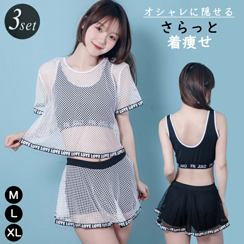 肌の露出が少ないデザインが嬉しい3点セット水着。