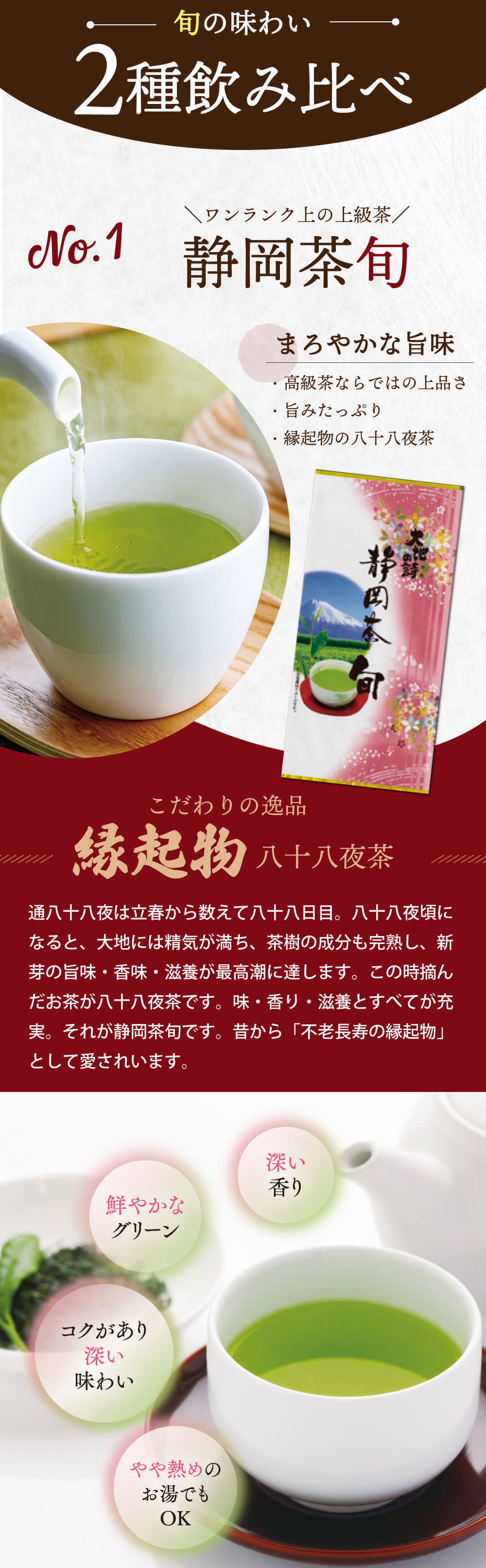 深い濃い緑色、香りは上品で、味は旨みコクがあり、まろやかな味わいが特徴です。