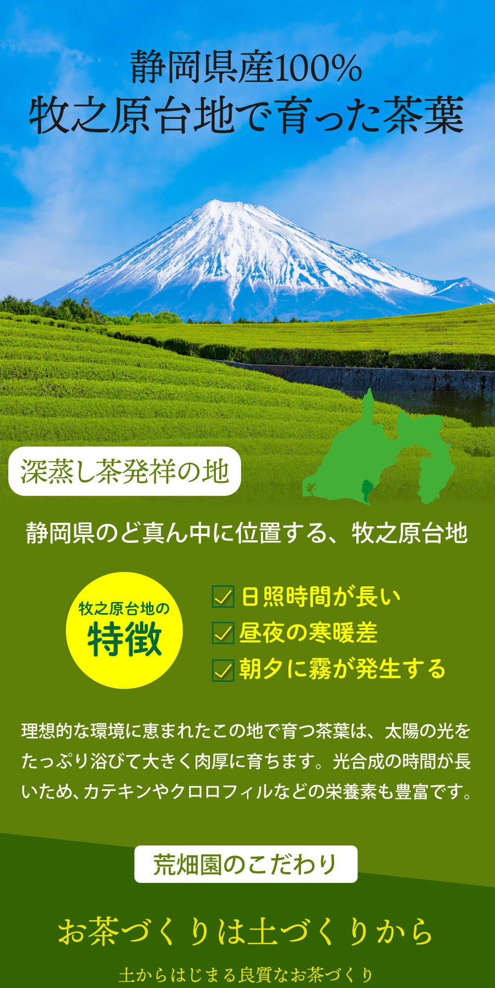 牧之原台地は平らな地形のため日照時間が長いので、葉肉の厚い栄養成分をたっぷり含んだ葉が育ちます。