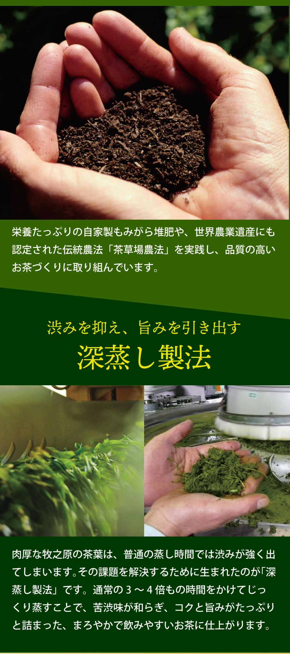 その葉を、通常の2〜3倍の時間をかけて葉の芯までしっかりと深く蒸すことにより、成分が分解され、タンニン(苦渋味)が減り、アミノ酸のテアニン(甘み)が増してまろやかで緑色の濃いお茶に出来上がります。