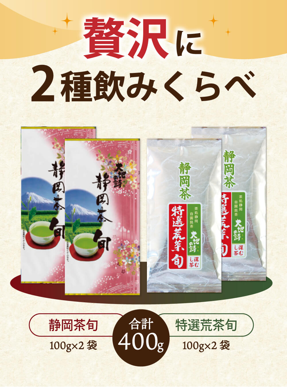 本茶(葉)の旨味、茎茶の爽やかな香り、芽茶のコク、粉茶の濃厚さがギュッと凝縮されています。産地ならではの味わいをお楽しみください。