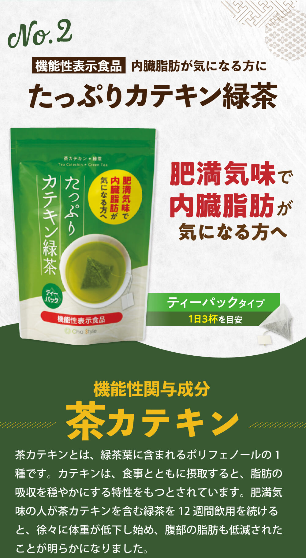 お茶に含まれる茶カテキンが内臓脂肪に働きかけるティーパックタイプのお茶です。