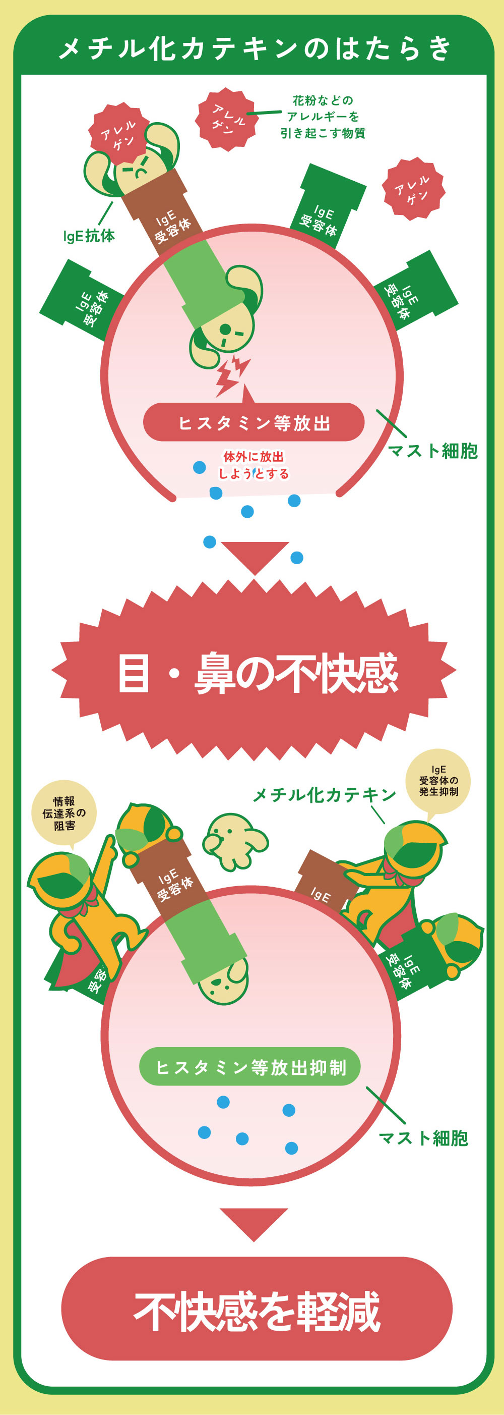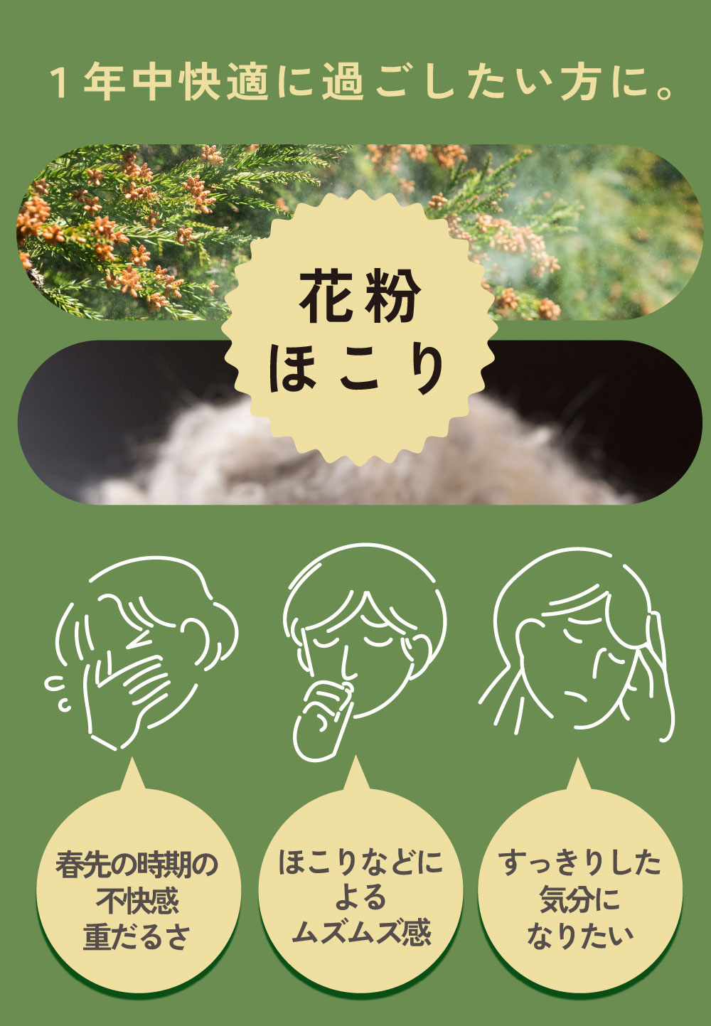 ●届出表示:メチル化カテキンは、ハウスダストやほこりなどによる目や鼻の不快感を軽減することが報告されています。