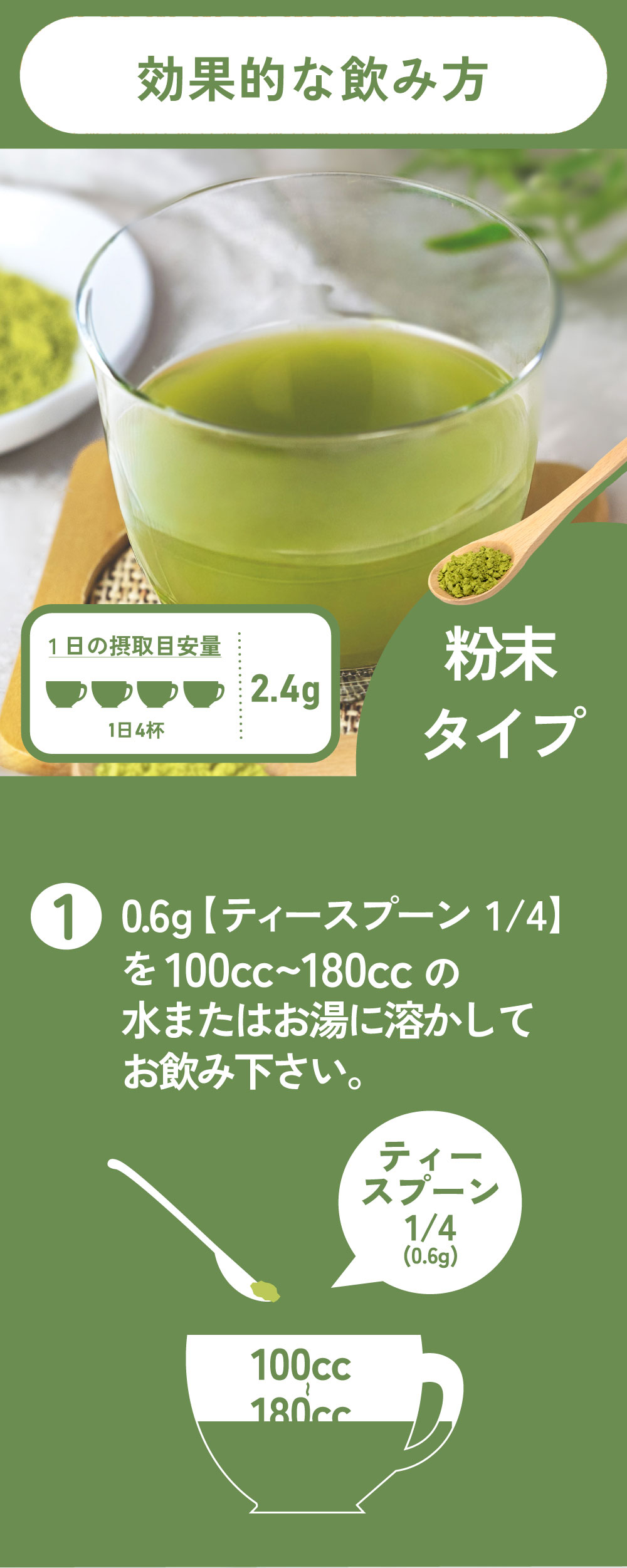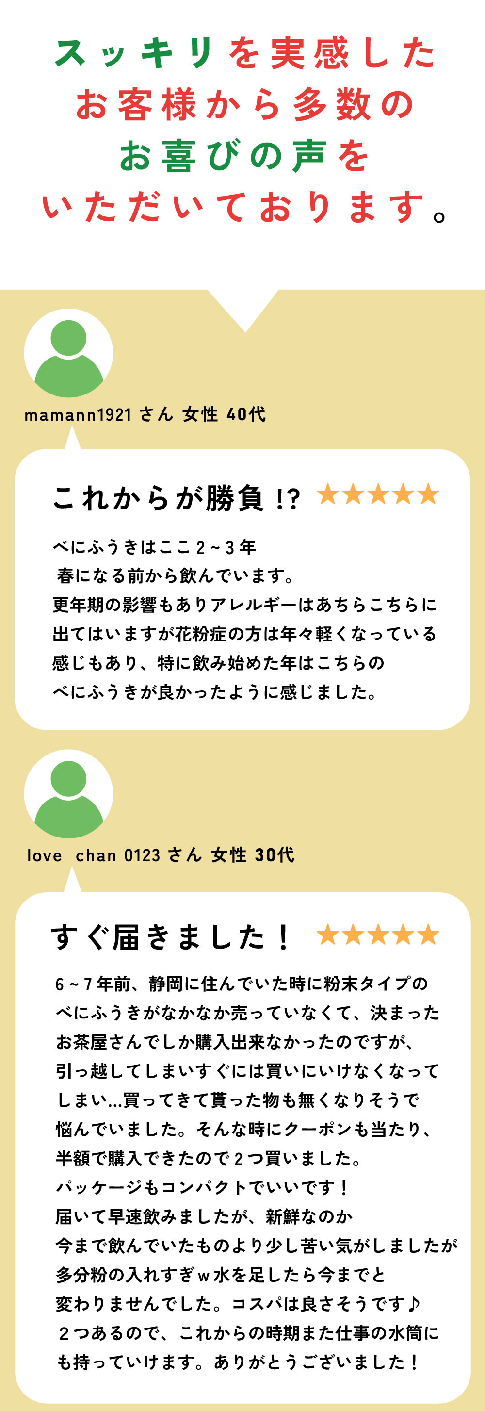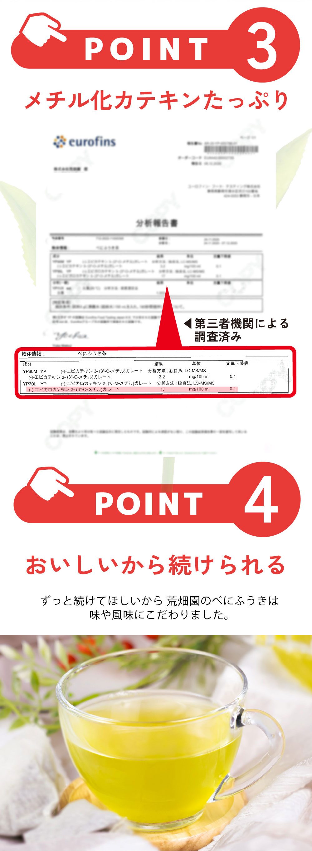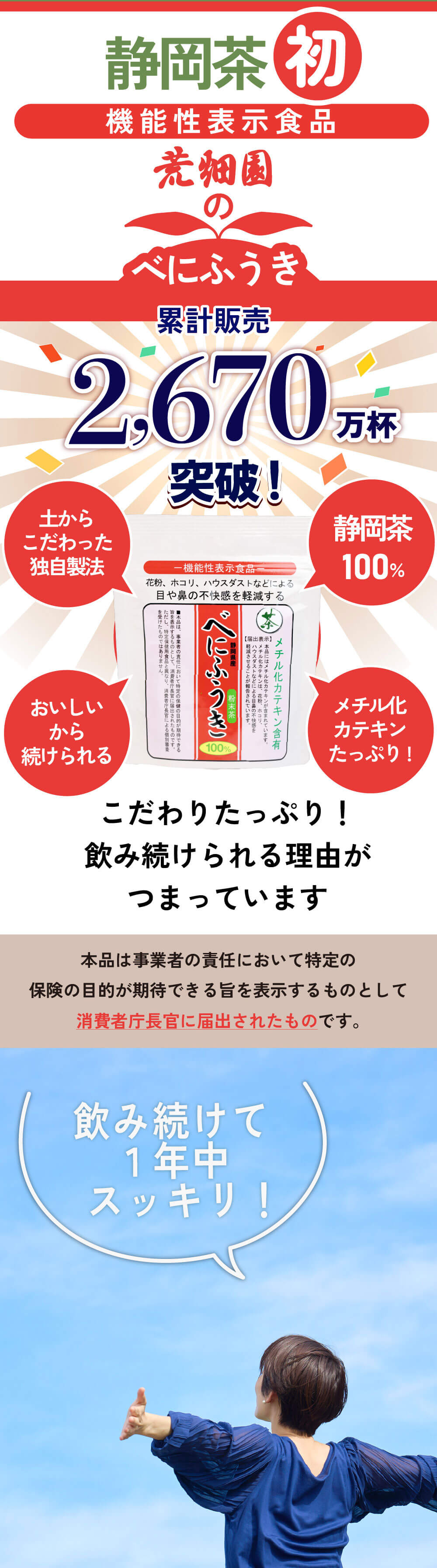毎年このメチル化カテキンが注目され、口コミで広がり多くの方にご愛飲いただいております。すっきり飲みやすいべにふうきを、ぜひお試しください。