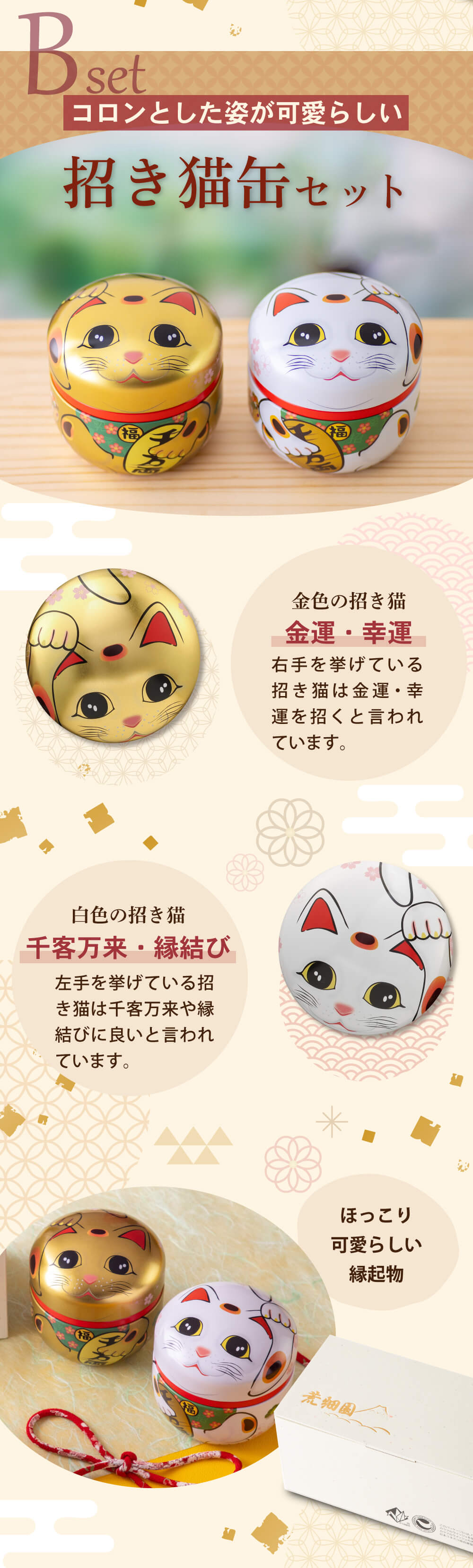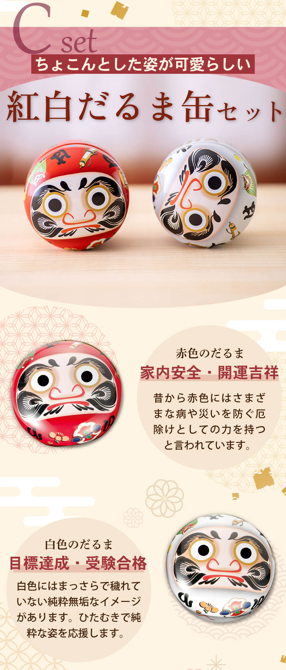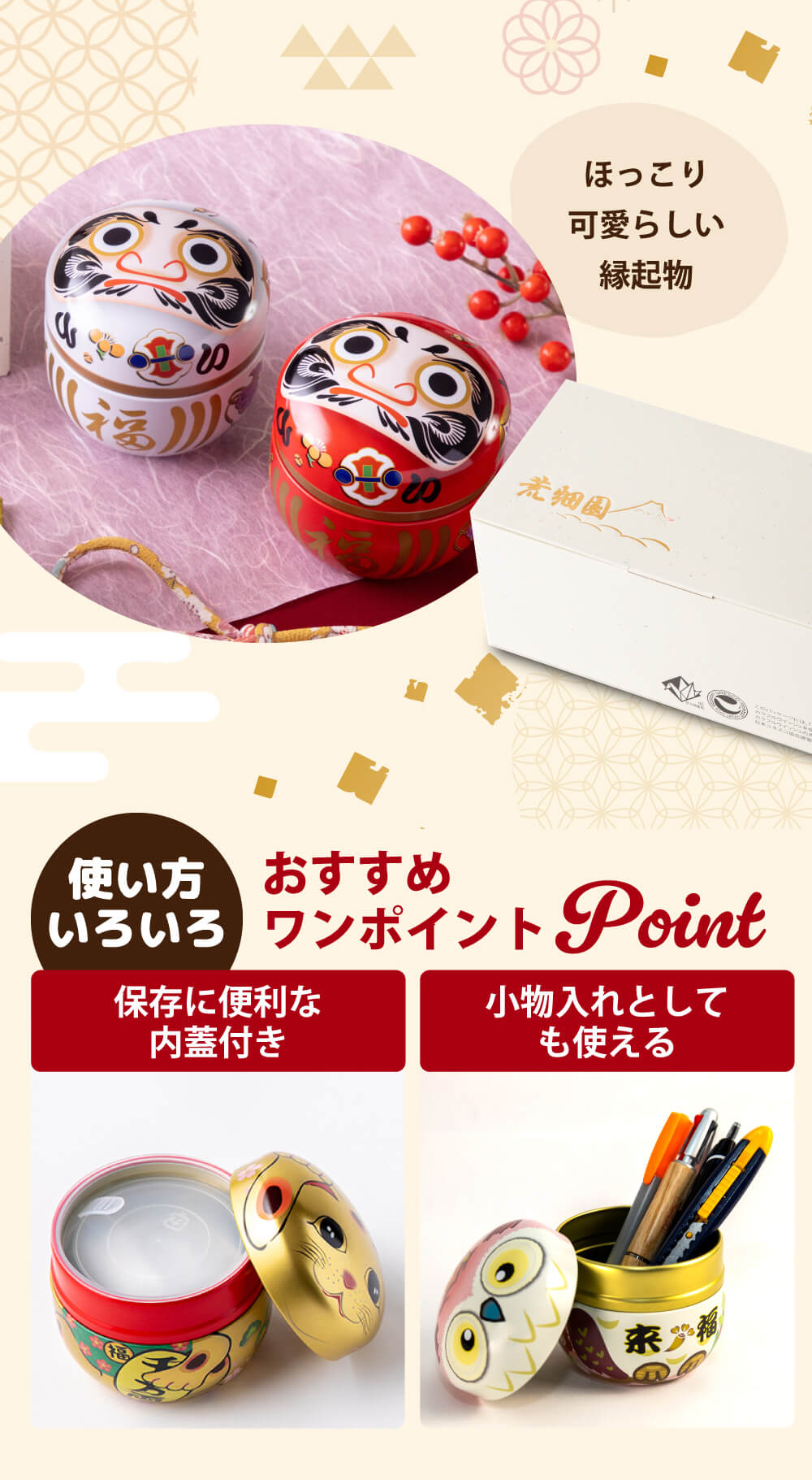 縁起物の「招き猫缶」「ふくろう缶」「紅白だるま缶」の3種類から選べます!