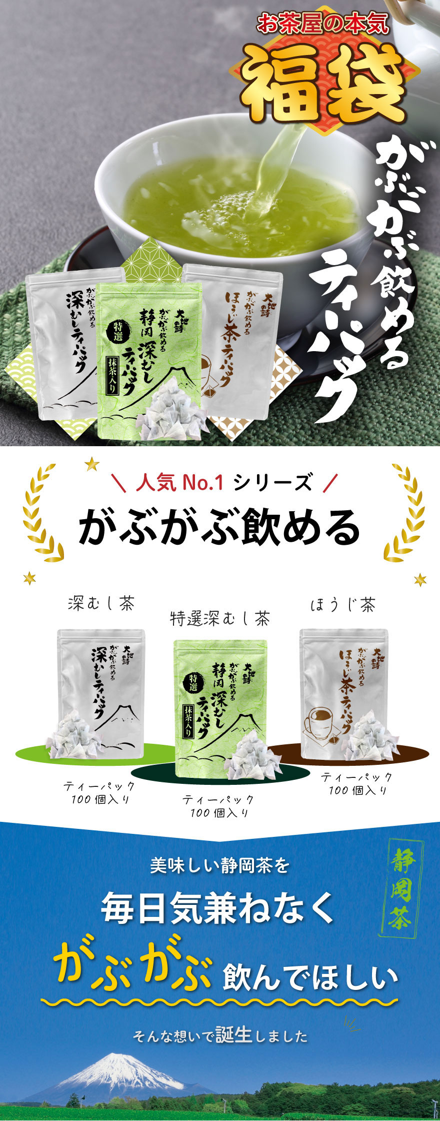 内容:特選がぶ飲み深むしティーパック(2.5g×100包入)×1袋、がぶ飲み深むしティーパック250g(2.5g×100個入り)×1袋、がぶ飲みほうじ茶ティーパック150g(1.5g×100個入り)×1袋