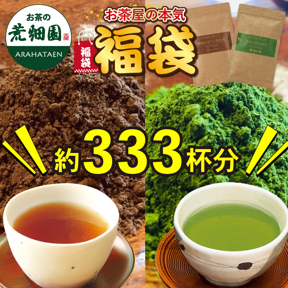 荒畑園で大人気の「お茶屋が作った静岡の粉末緑茶」と「お茶屋が作った静岡のほうじ茶粉末」を各1袋ずつ福袋に詰め込みました!
